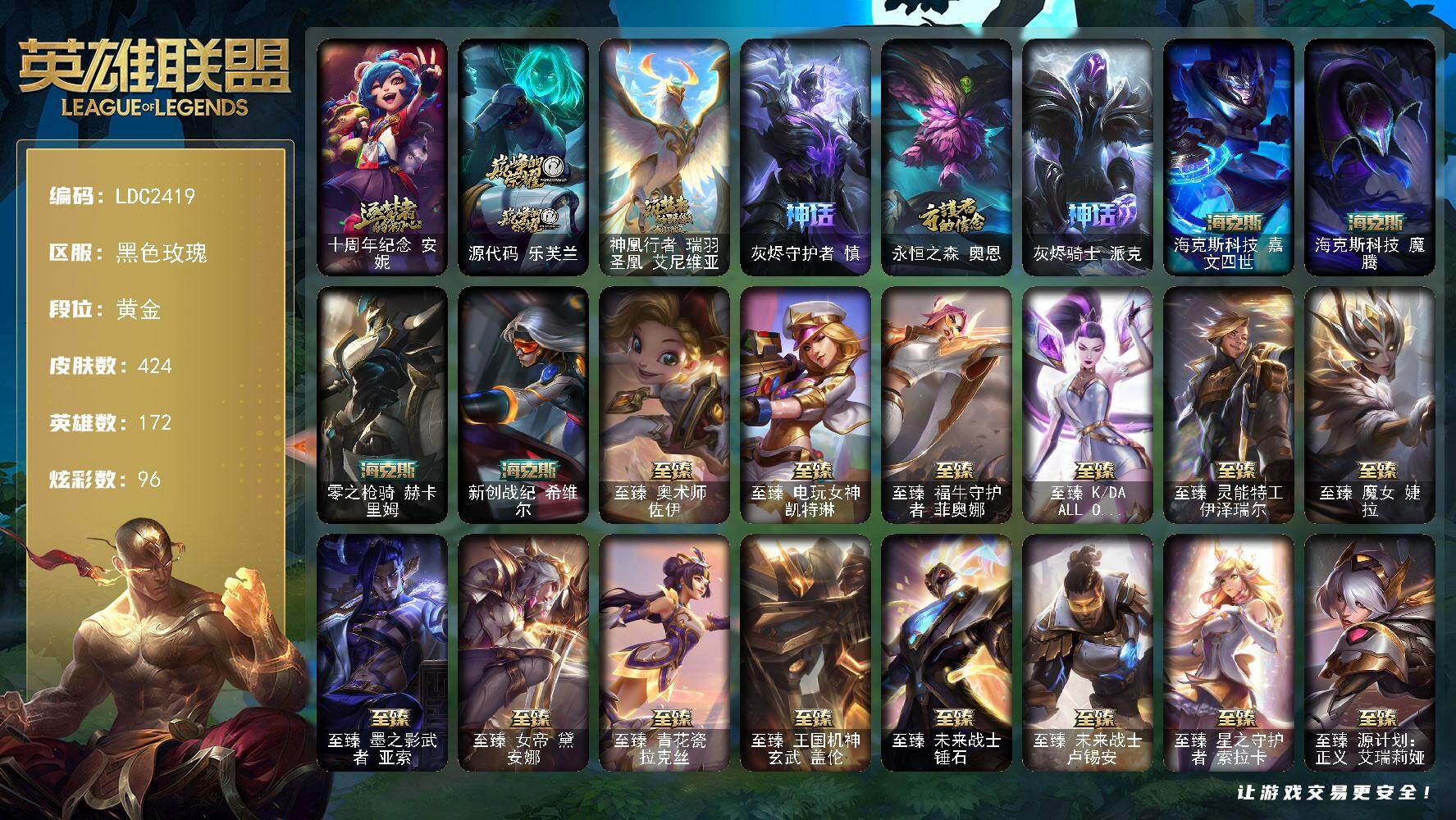 172英雄/424皮肤/4终极/28神话/73限定/8臻彩/96炫彩/36传说/87史诗/黄金/十周年纪念安妮