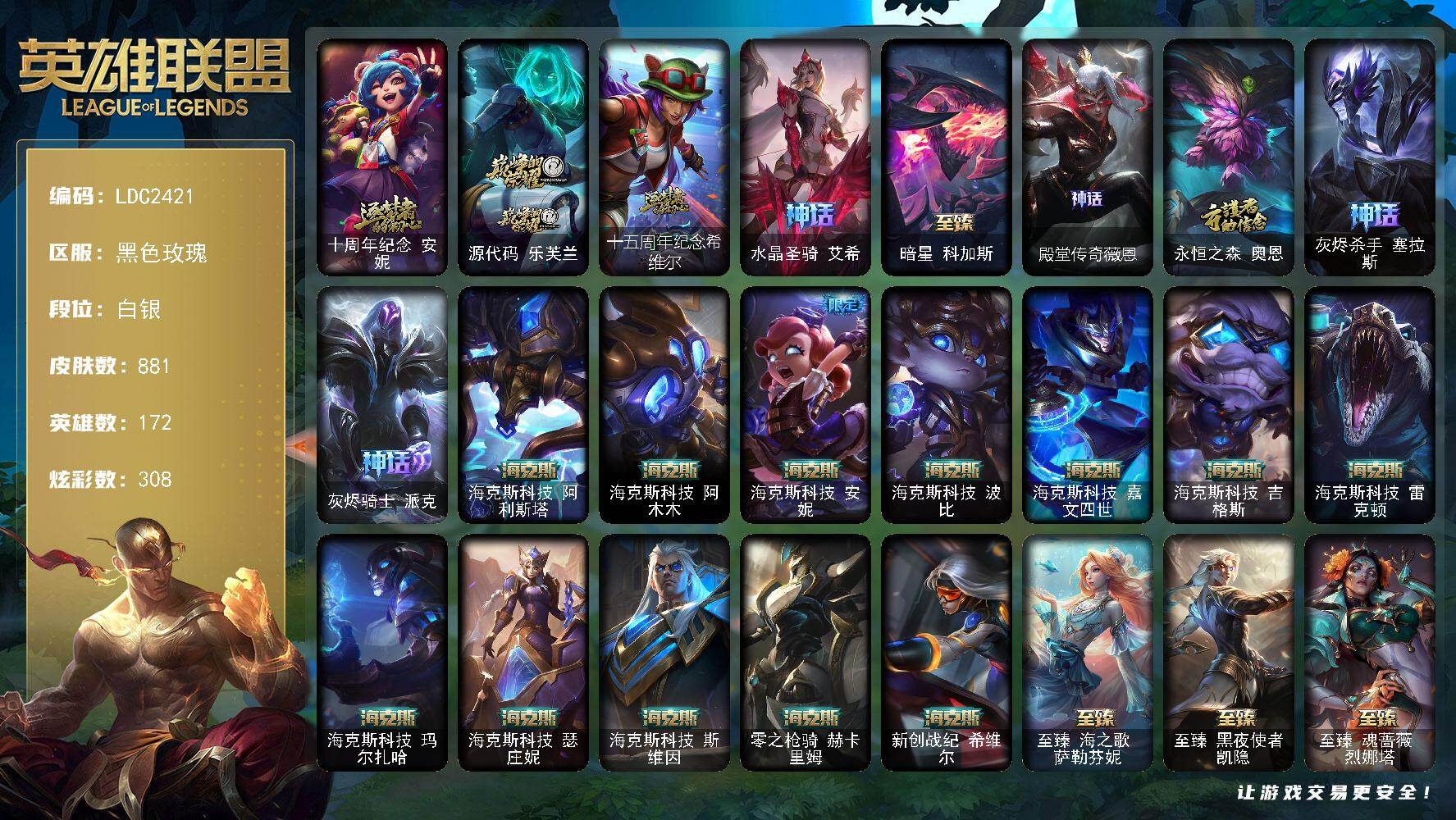 172英雄/881皮肤/2终极/54神话/127限定/23臻彩/308炫彩/82传说/188史诗