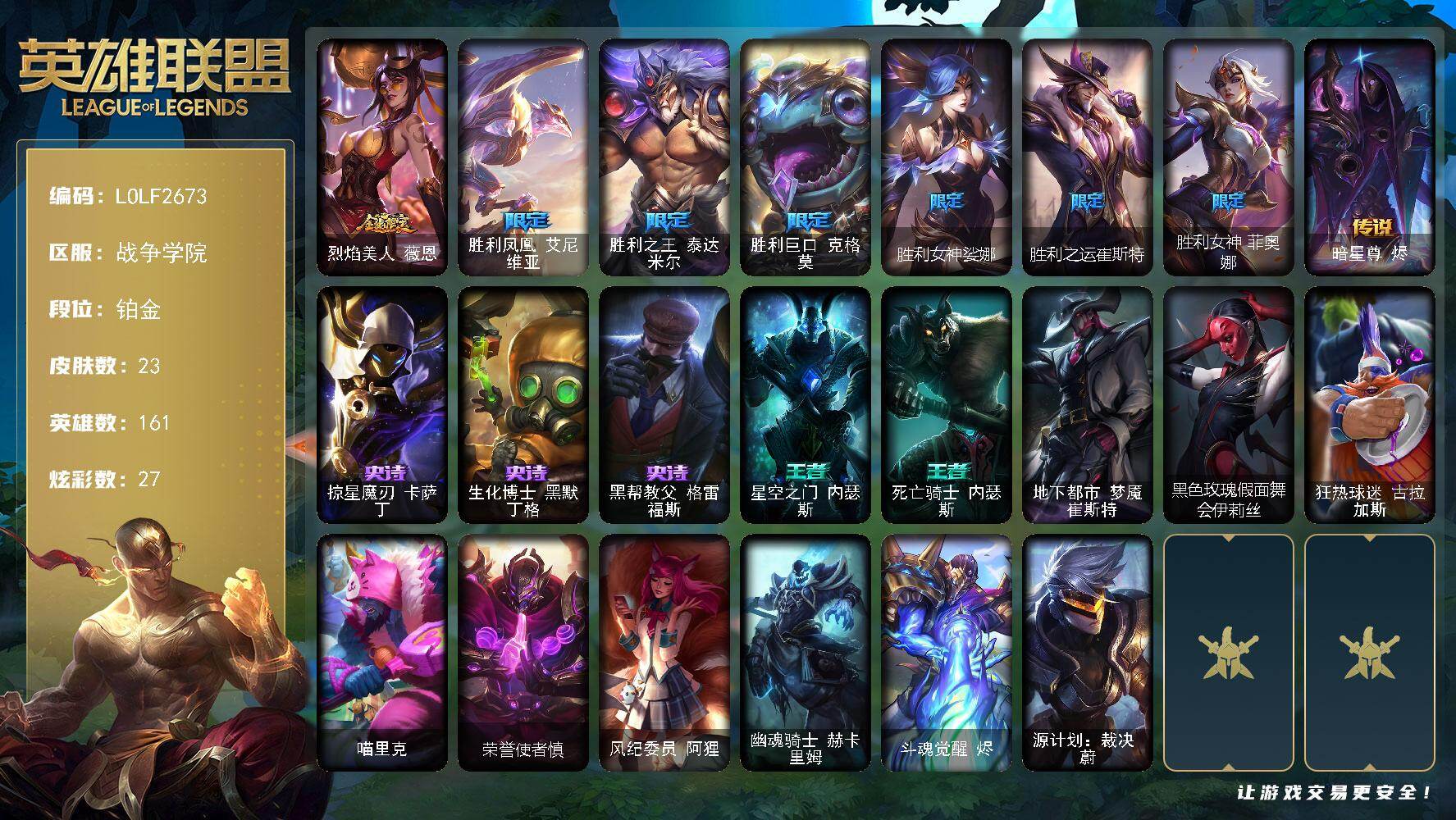 161英雄/23皮肤/8限定/27炫彩/1传说/3史诗/铂金/烈焰美人薇恩/胜利凤凰艾尼维亚/