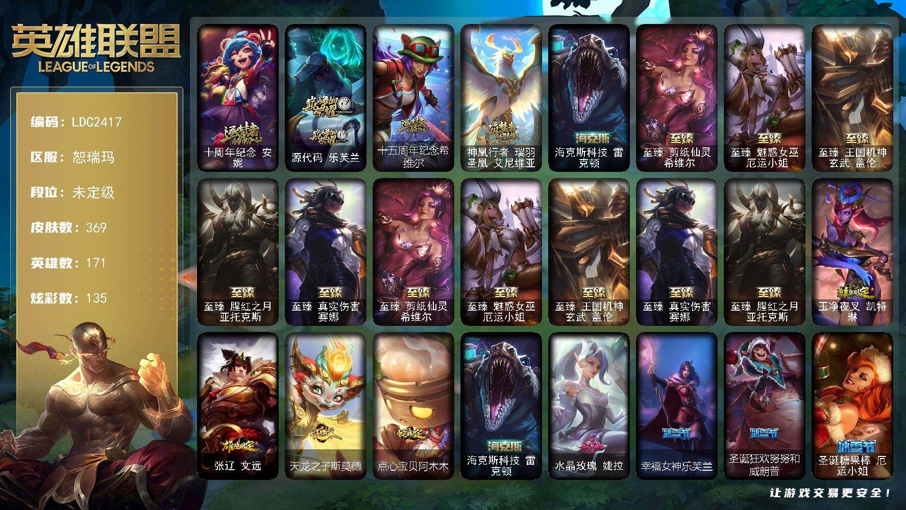 171英雄/369皮肤/1终极/10神话/52限定/8臻彩/135炫彩/54传说/87史诗/未定级