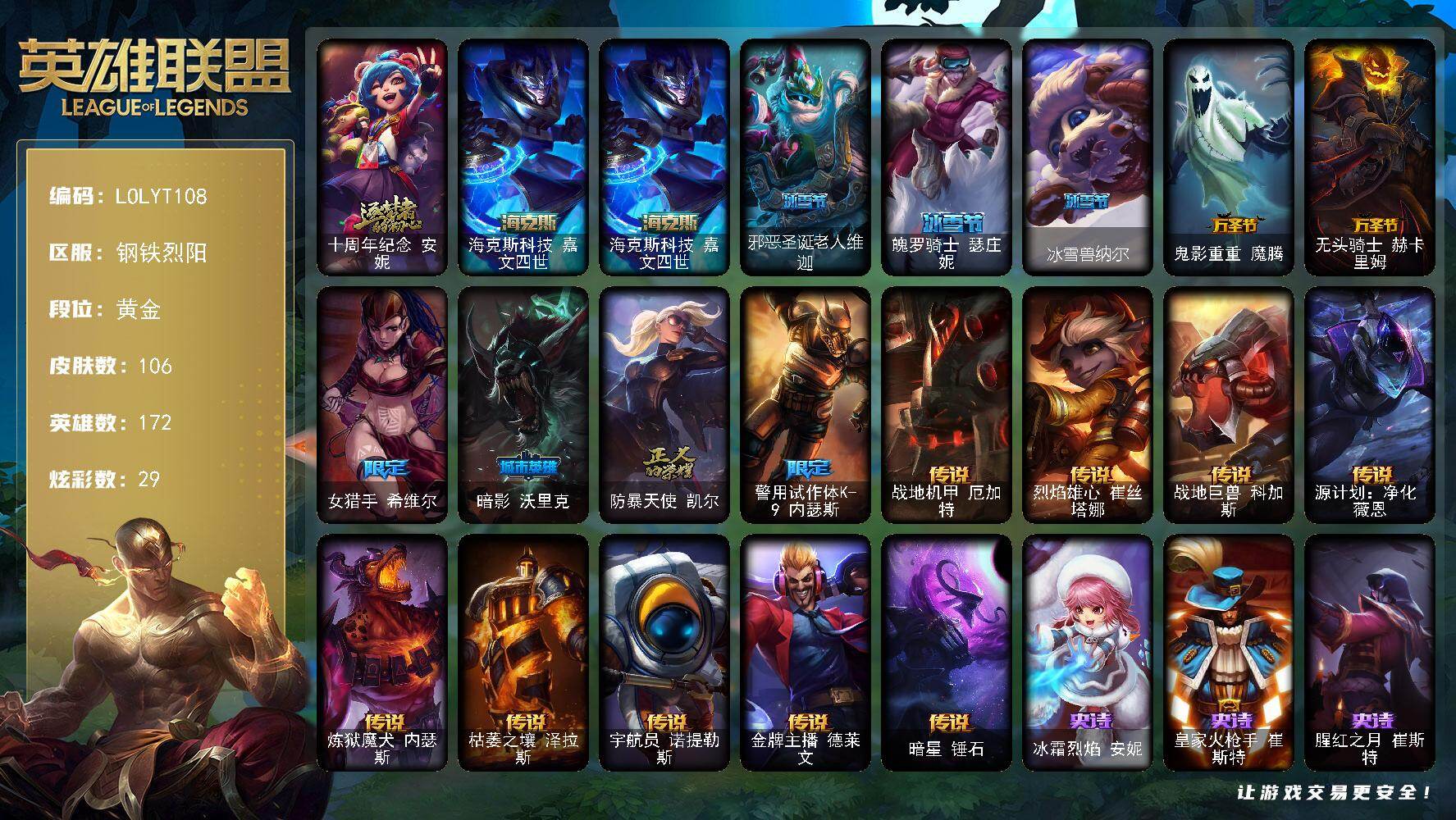 172英雄/106皮肤/2神话/10限定/1臻彩/29炫彩/9传说/30史诗