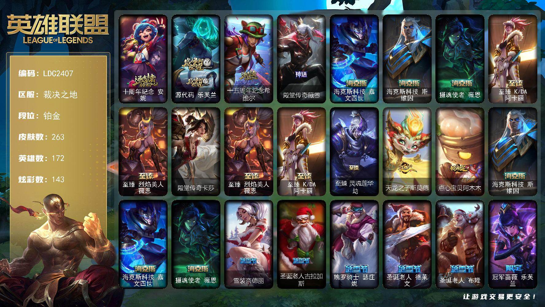 172英雄/263皮肤/10神话/28限定/12臻彩/143炫彩/30传说/68史诗