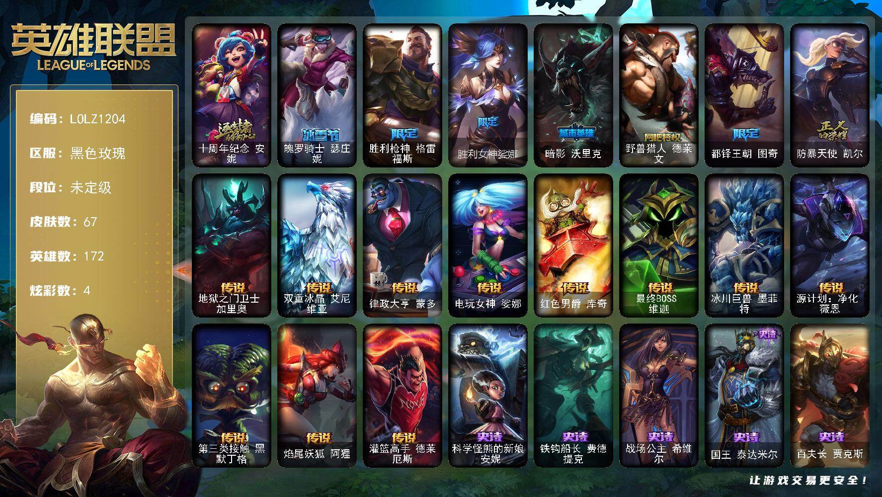 70英雄/89皮肤/1终极/3神话/12限定/8臻彩/15炫彩/13传说/7史诗/黑铁账号等级:39/