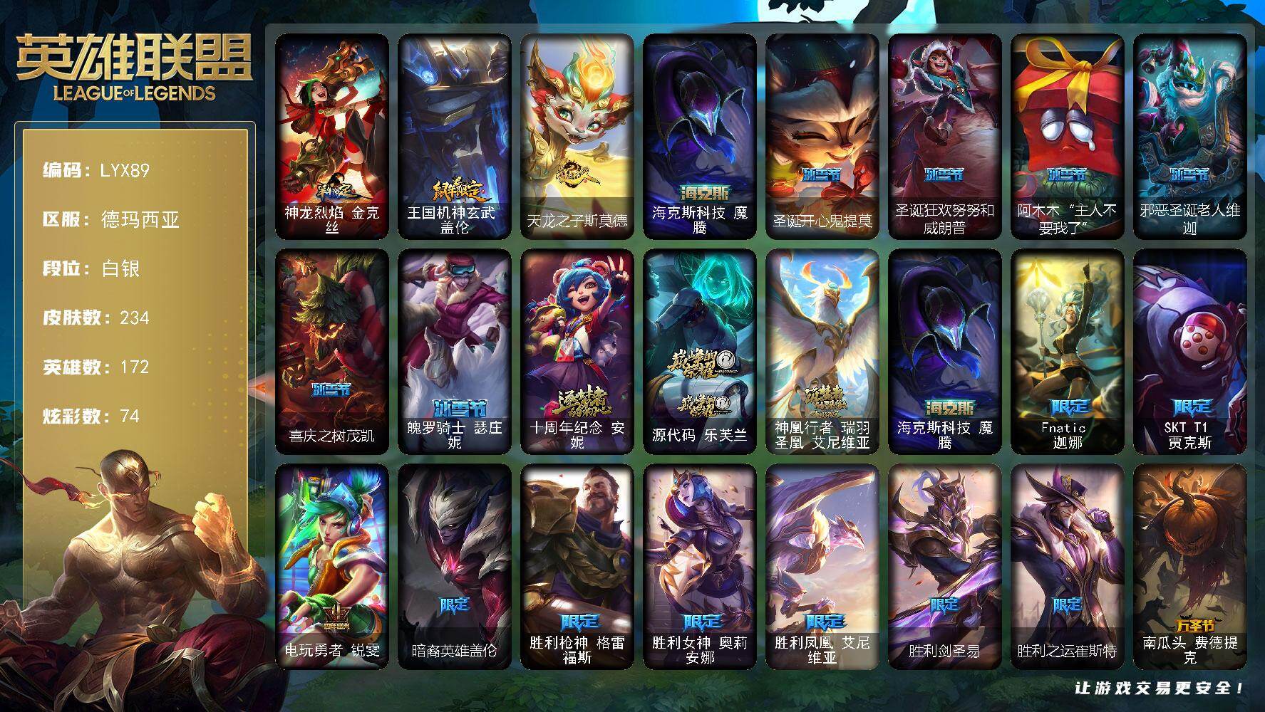 白银段位-172英雄-234皮肤-74炫彩-0终极-4神话-24限定-26传说