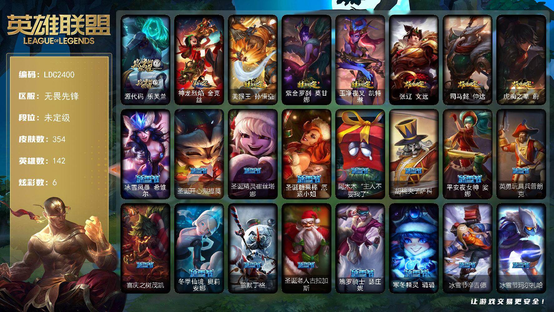 142英雄/354皮肤/4终极/1神话/54限定/6炫彩/35传说/91史诗/未定级账号等级:96/