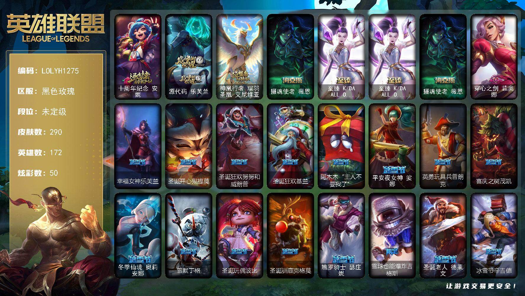 172英雄/290皮肤/5神话/74限定/3臻彩/50炫彩/31传说/69史诗/未定级账号等级:411/