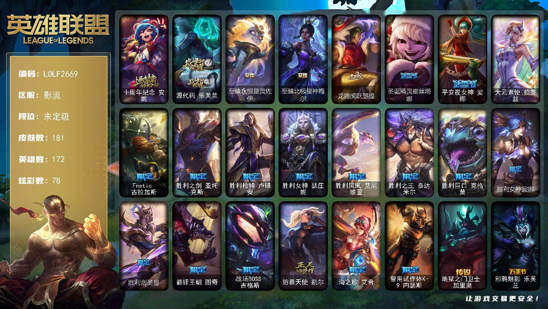 172英雄/181皮肤/1终极/4神话/18限定/4臻彩/78炫彩/10传说/39史诗/未定级