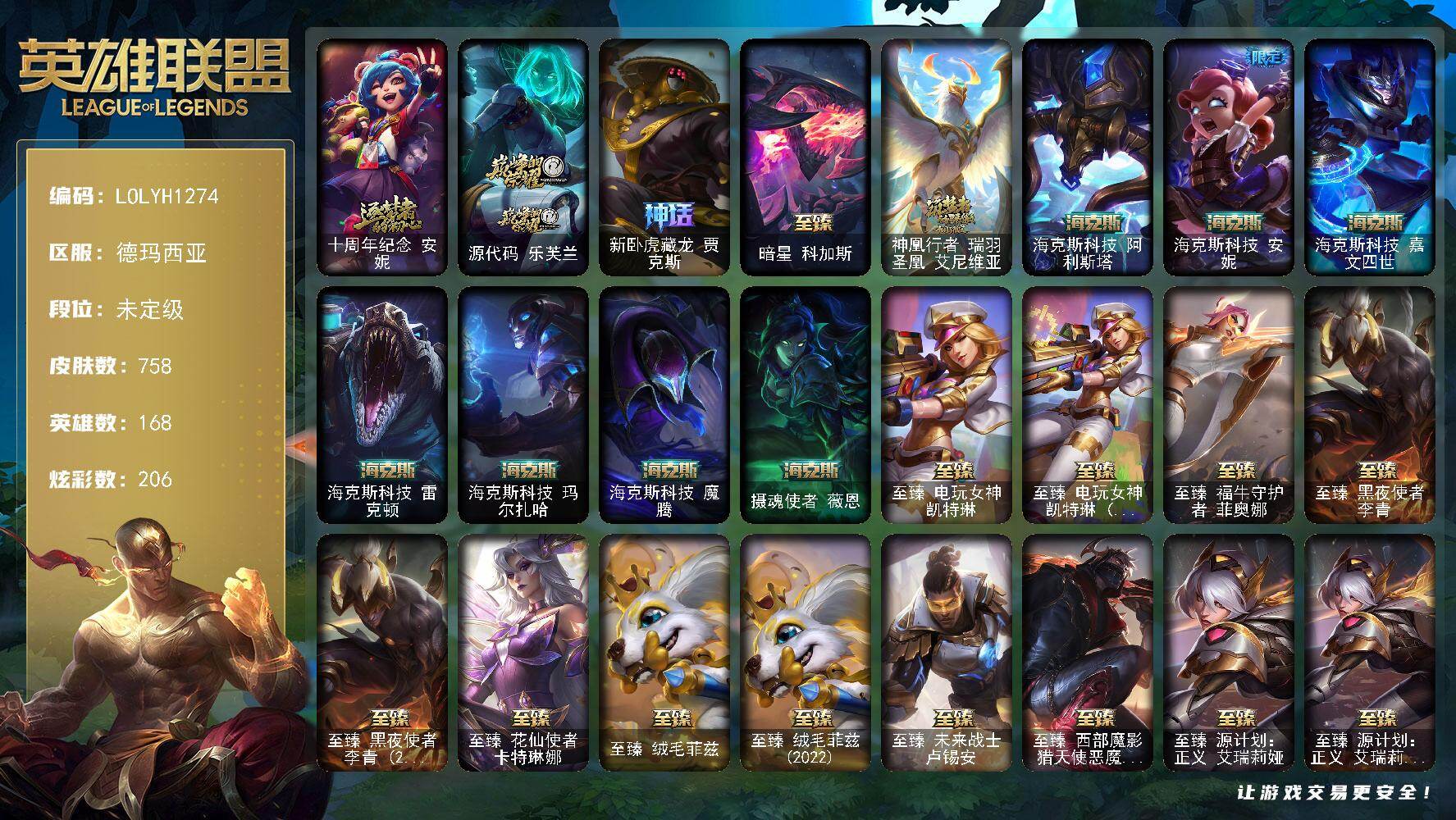 168英雄/758皮肤/2终极/32神话/133限定/12臻彩/206炫彩/64传说/187史诗/未定级/