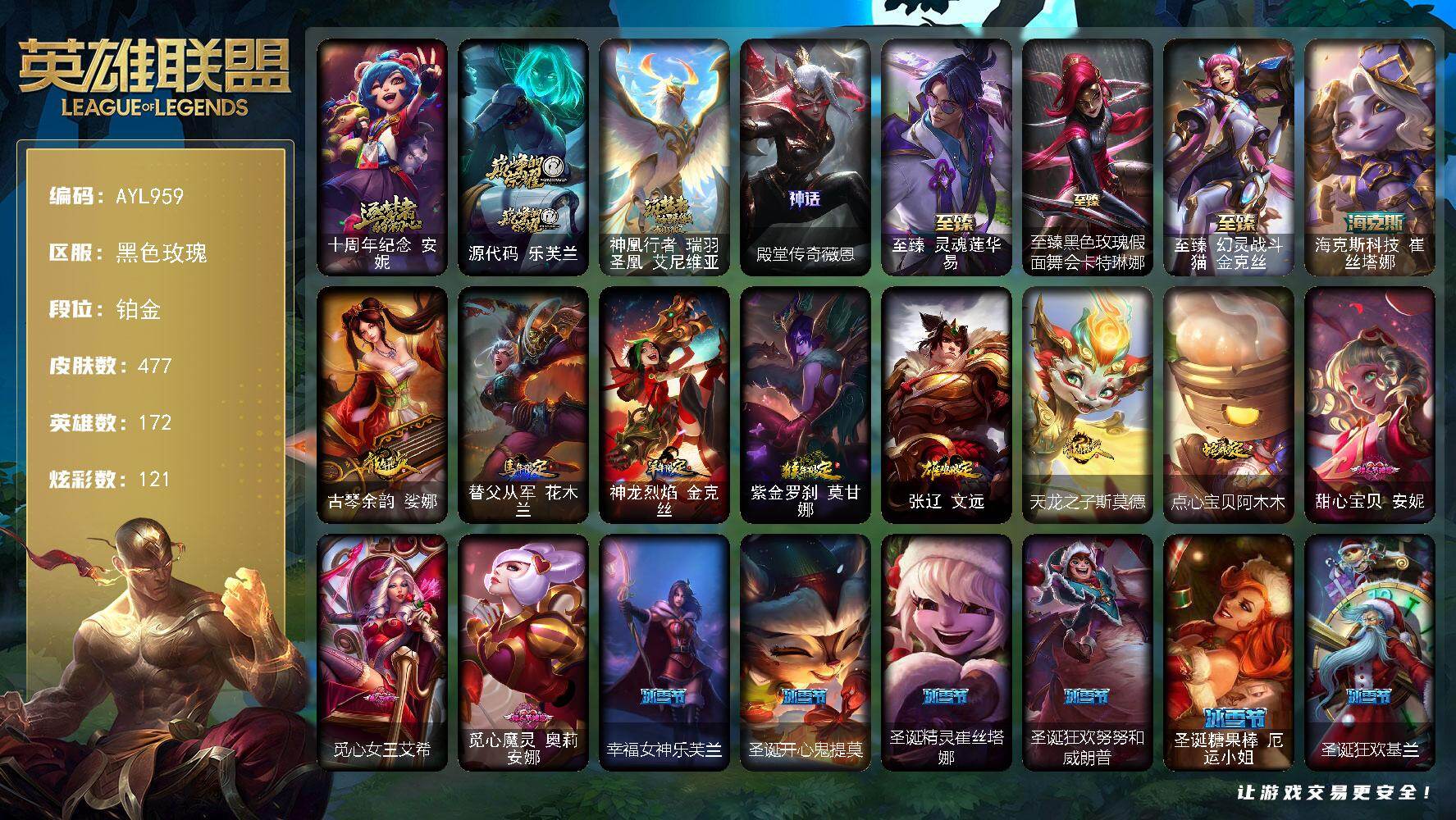 【特价出售/店主推荐】铂金段位-172英雄-477皮肤-121炫彩-1终极-