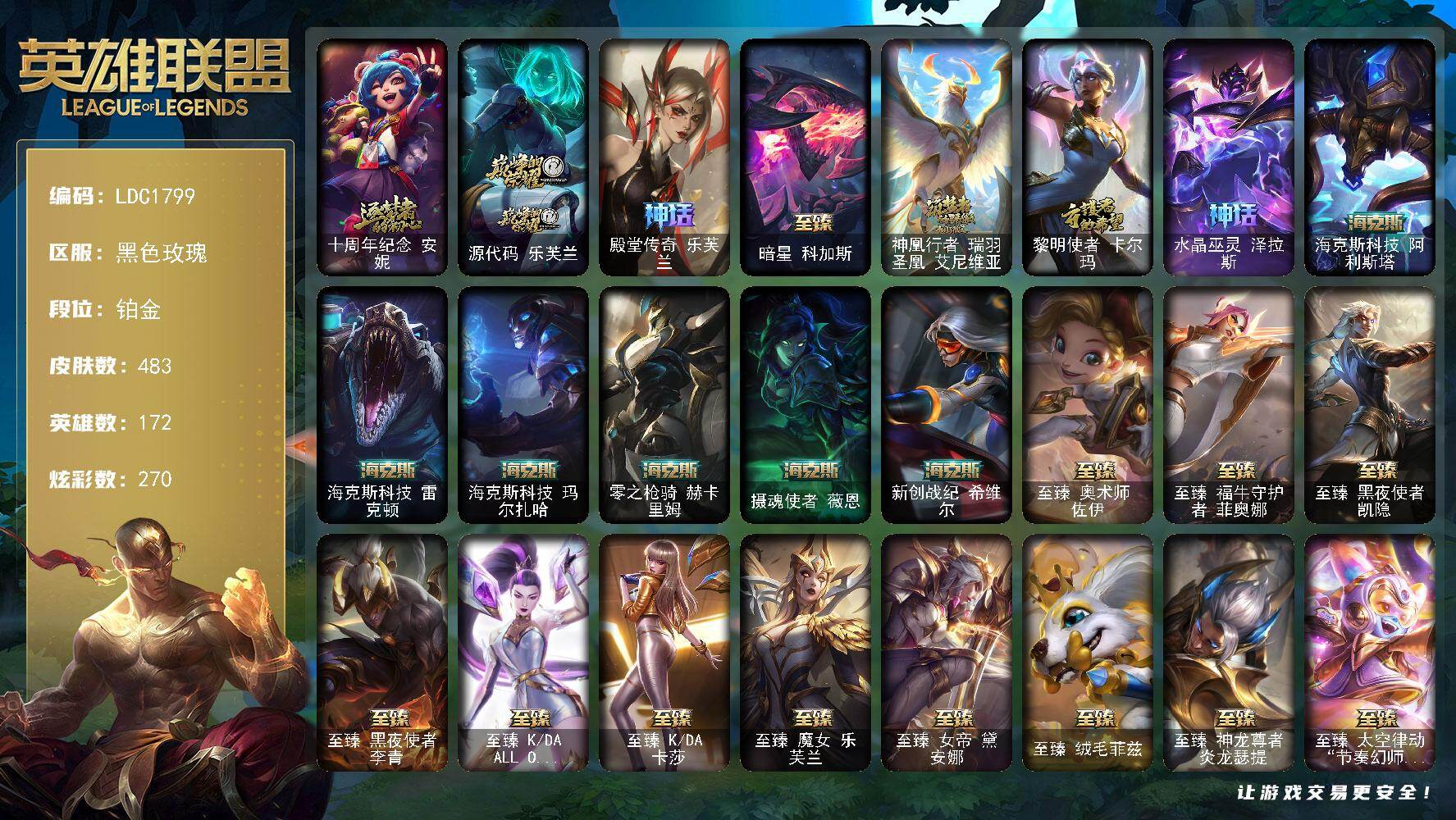 172英雄/483皮肤/35神话/55限定/18臻彩/270炫彩/58传说/120史诗/铂金/十周年纪念安妮/