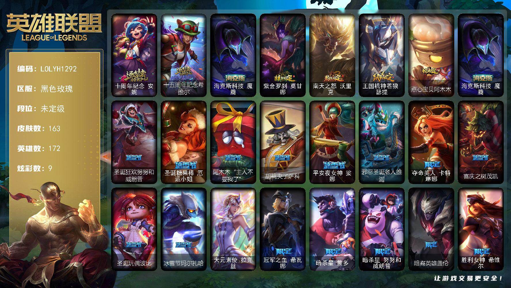 172英雄/163皮肤/1终极/3神话/28限定/3臻彩/9炫彩/20传说/52史诗/未定级