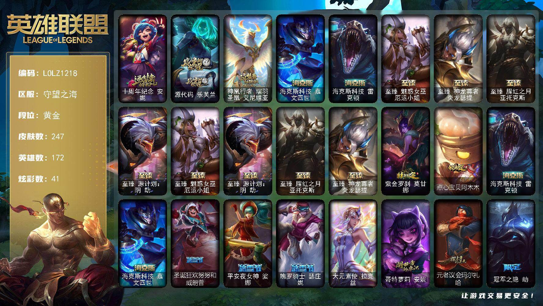 172英雄/247皮肤/1终极/9神话/33限定/6臻彩/41炫彩/31传说/75史诗