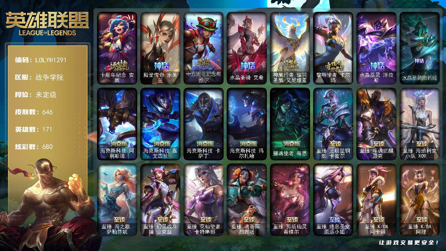 171英雄/646皮肤/3终极/51神话/91限定/22臻彩/680炫彩/65传说/118史诗