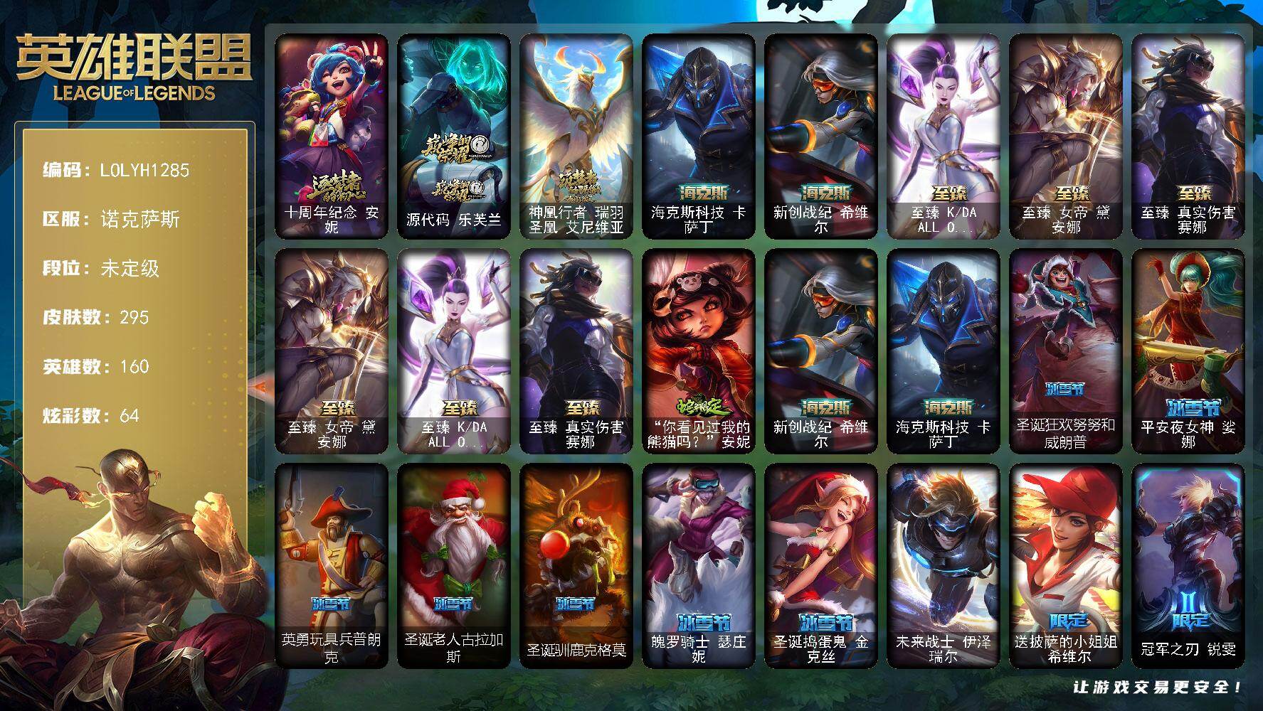 160英雄/295皮肤/1终极/8神话/38限定/1臻彩/64炫彩/24传说/82史诗/未定级/十周年纪念安妮/