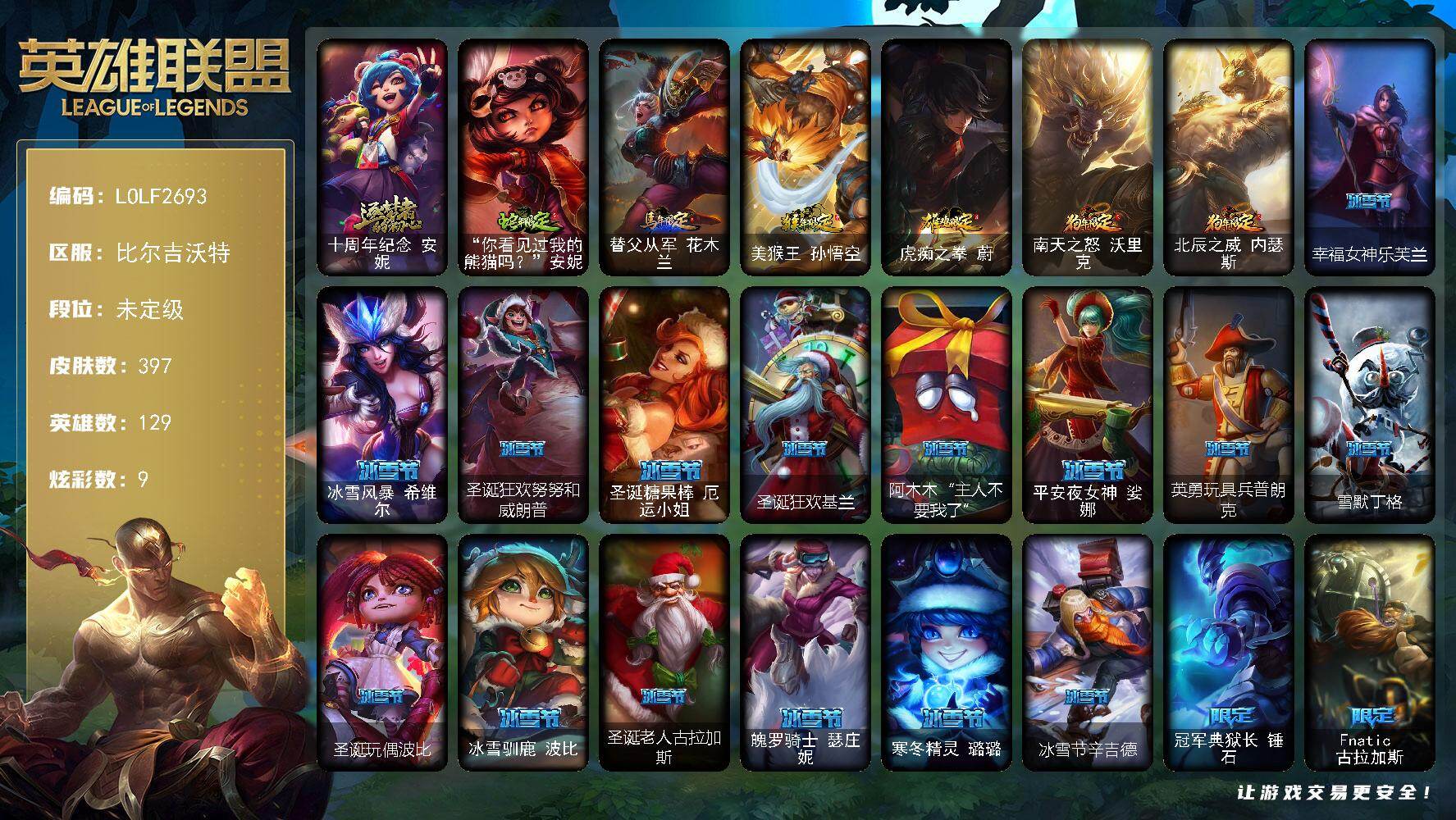 129英雄/397皮肤/1神话/50限定/3臻彩/9炫彩/30传说/117史诗