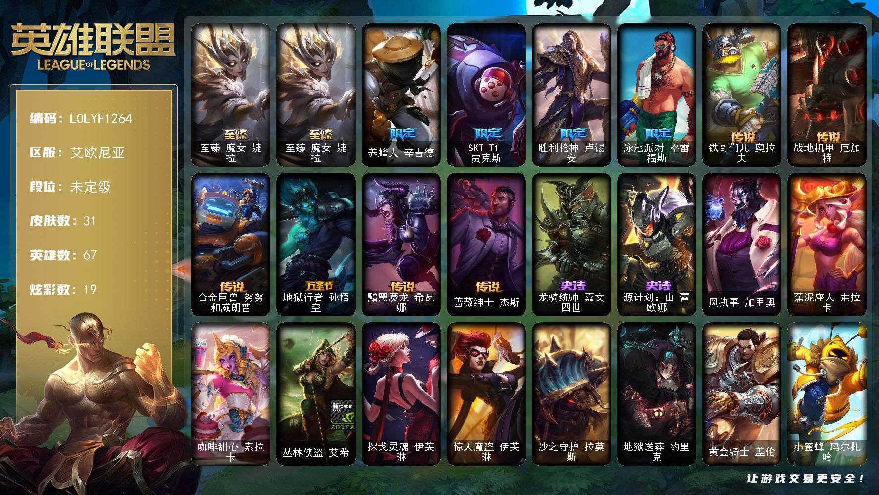 67英雄/31皮肤/1神话/4限定/19炫彩/6传说/2史诗/未定级