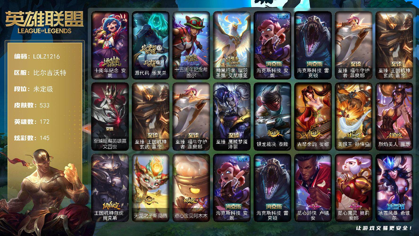 172英雄/533皮肤/4终极/10神话/89限定/13臻彩/145炫彩/47传说/130史诗/未定级