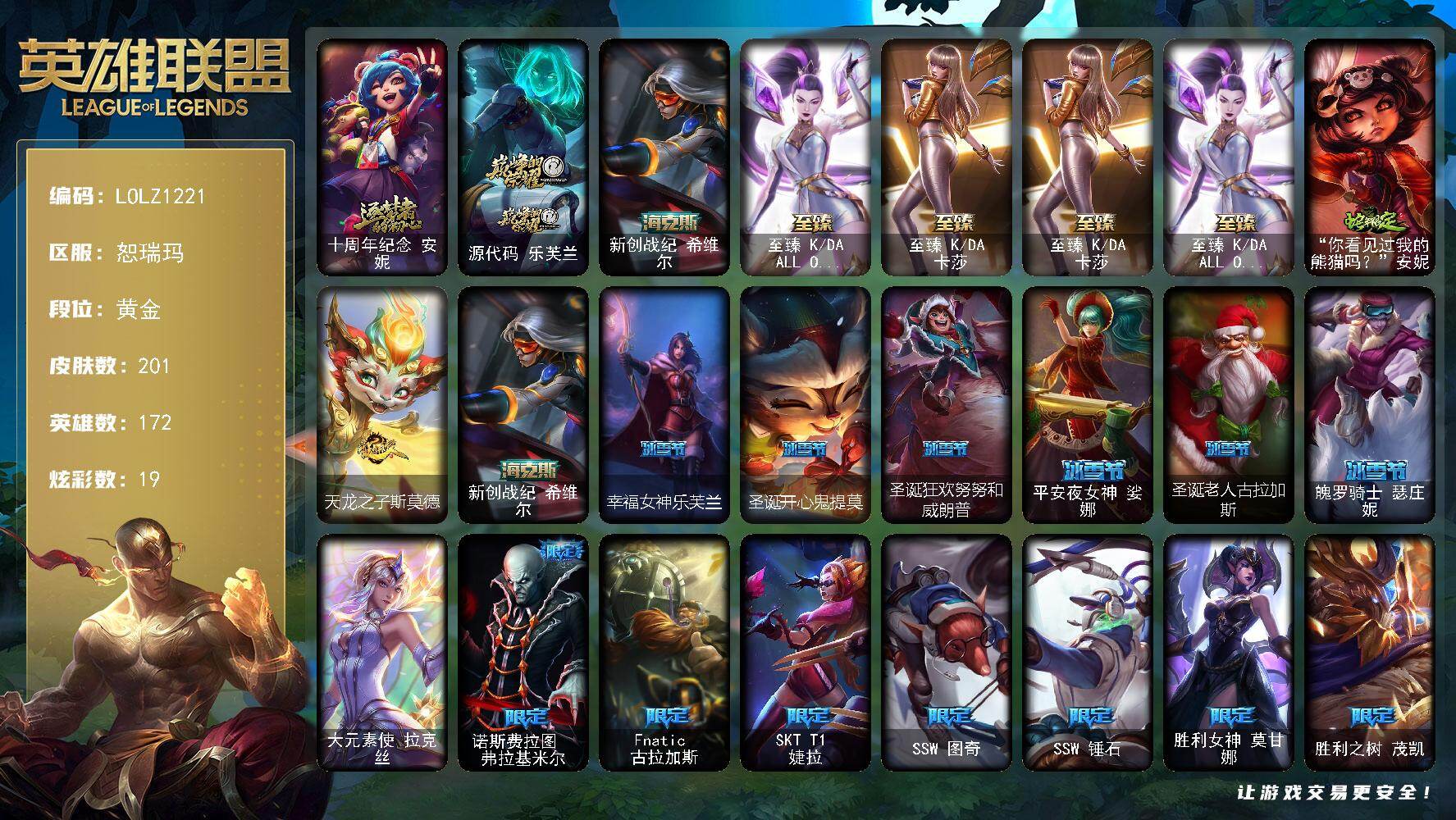 172英雄/201皮肤/1终极/5神话/31限定/19炫彩/22传说/56史诗
