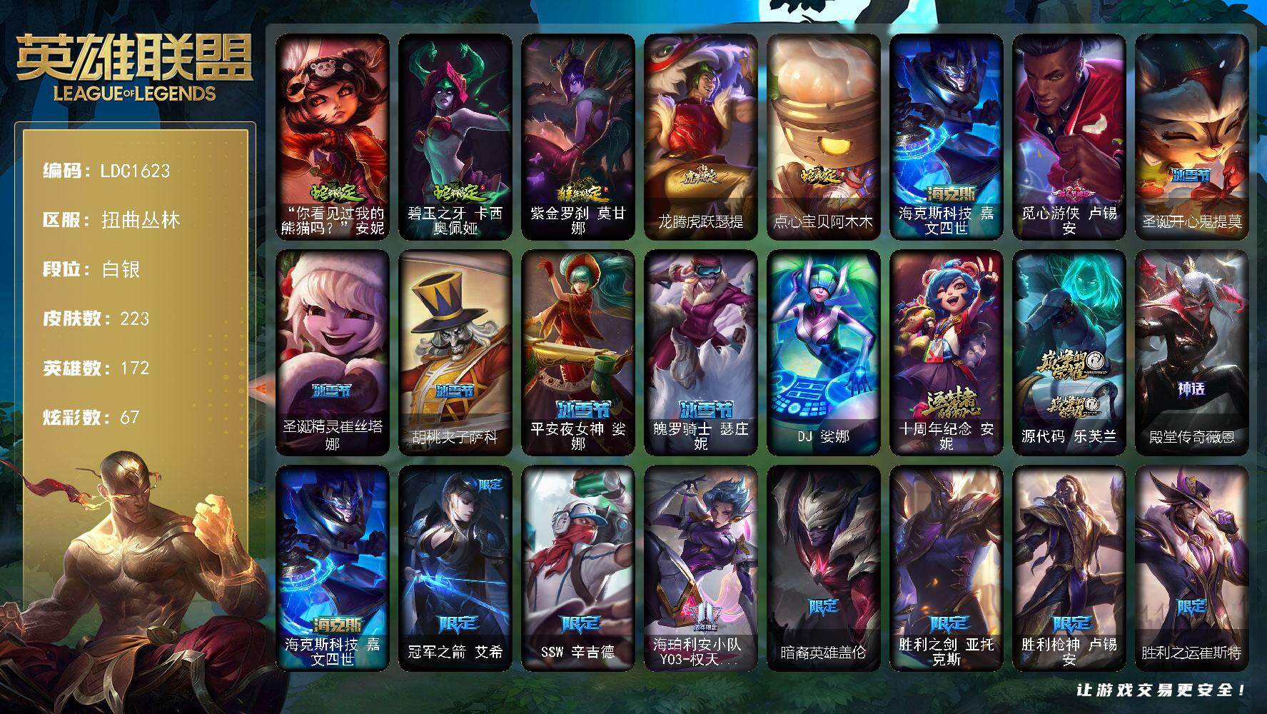 172英雄/223皮肤/1终极/4神话/24限定/5臻彩/67炫彩/28传说/45史诗/白银账号等级:236/