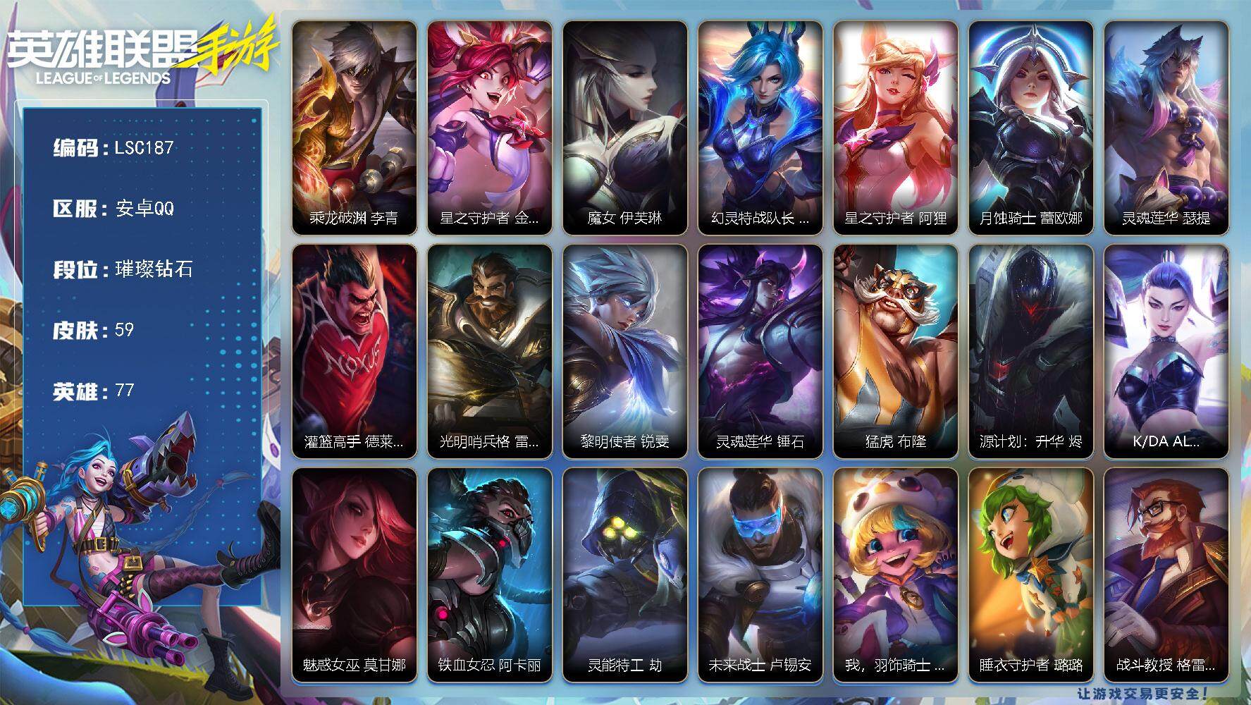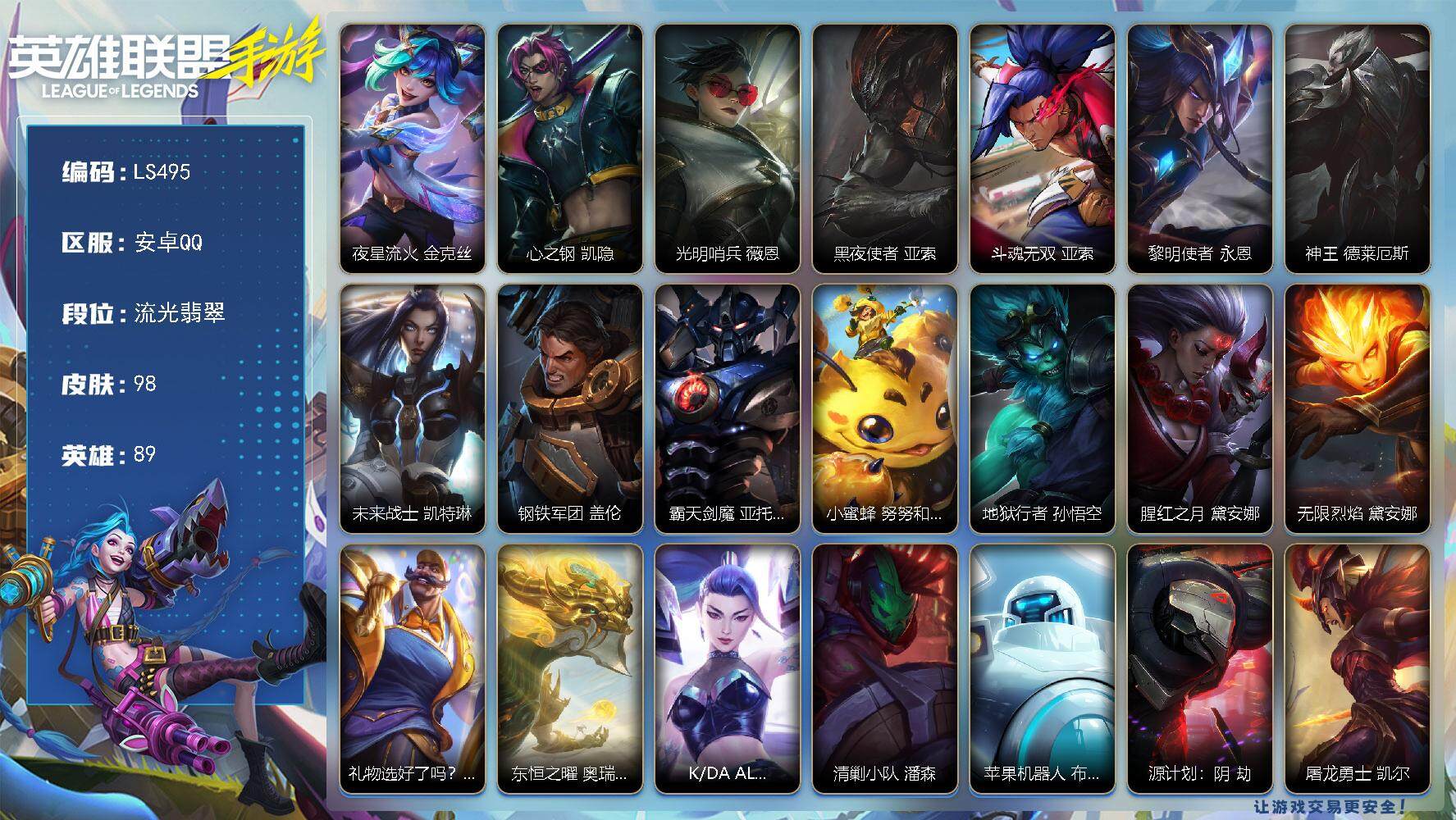 英雄联盟手游(lol)【安卓QQ】89英雄/98皮肤/流光翡翠/夜星流火 金克丝
