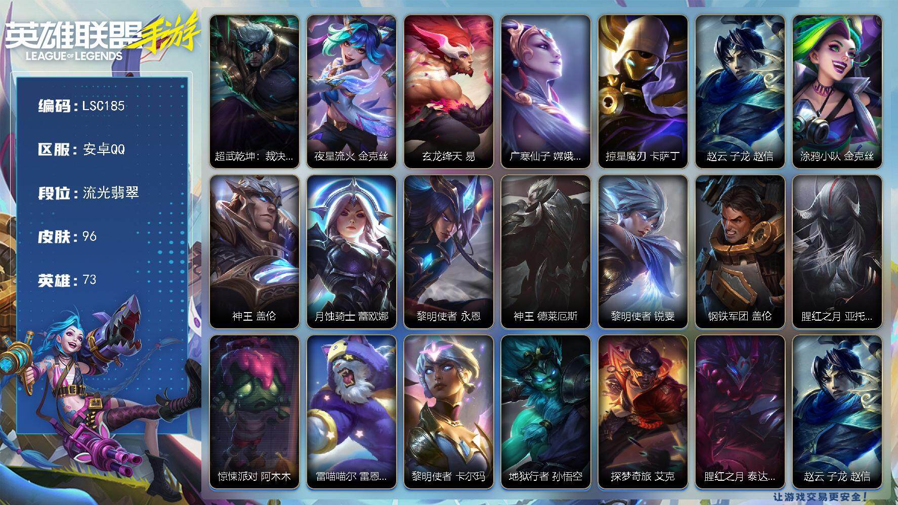 英雄联盟手游(lol)【安卓QQ】73英雄/96皮肤/1典藏/2神话/5传说/41史诗/流光翡翠/