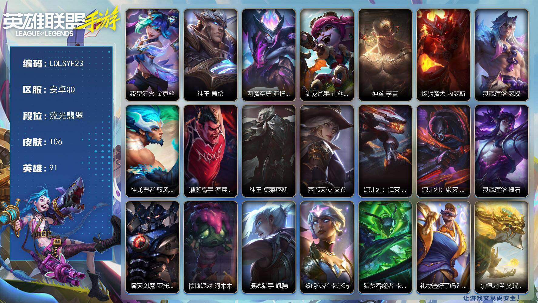 英雄联盟手游(lol)【安卓QQ】91英雄/106皮肤/流光翡翠/夜星流火