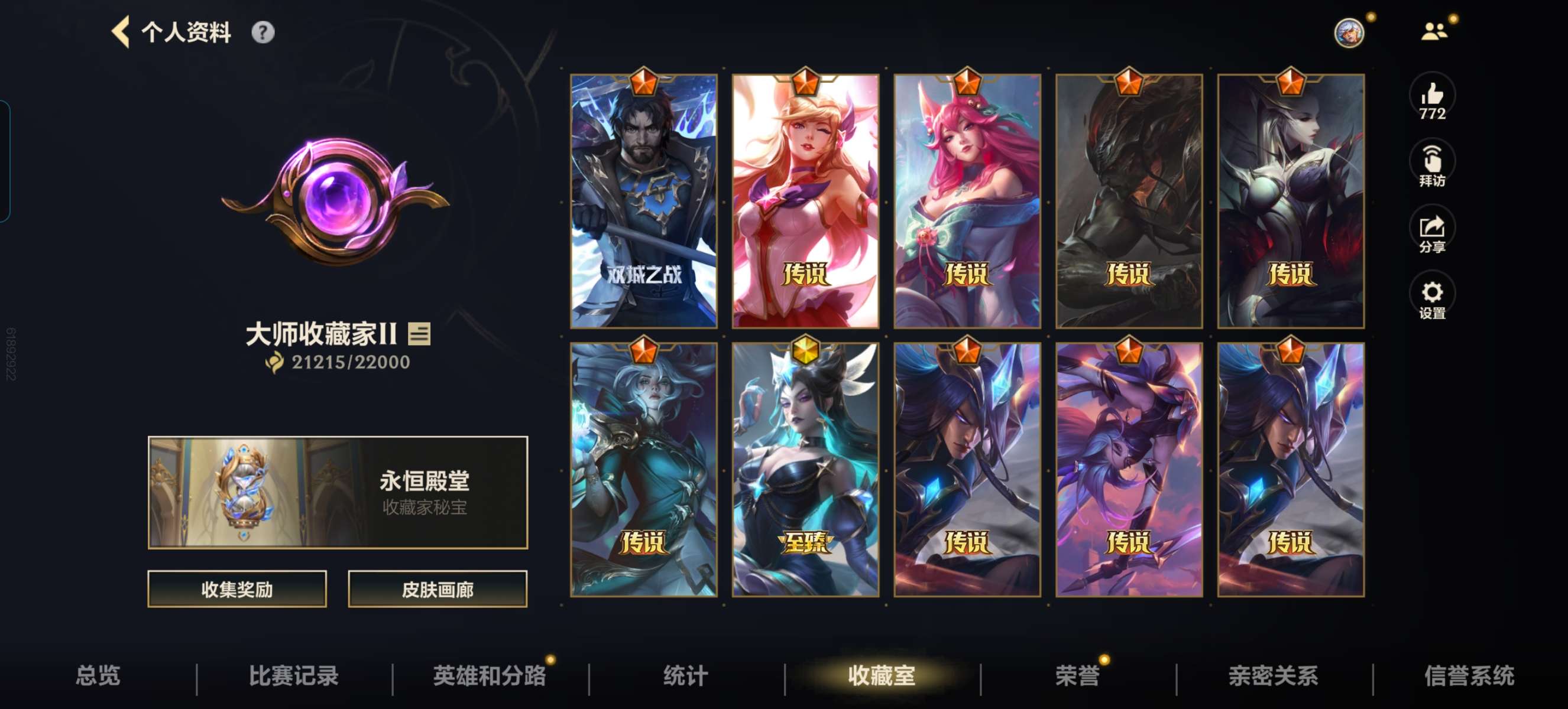 102英雄/82皮肤/1典藏/4传说/21史诗/超凡大师/