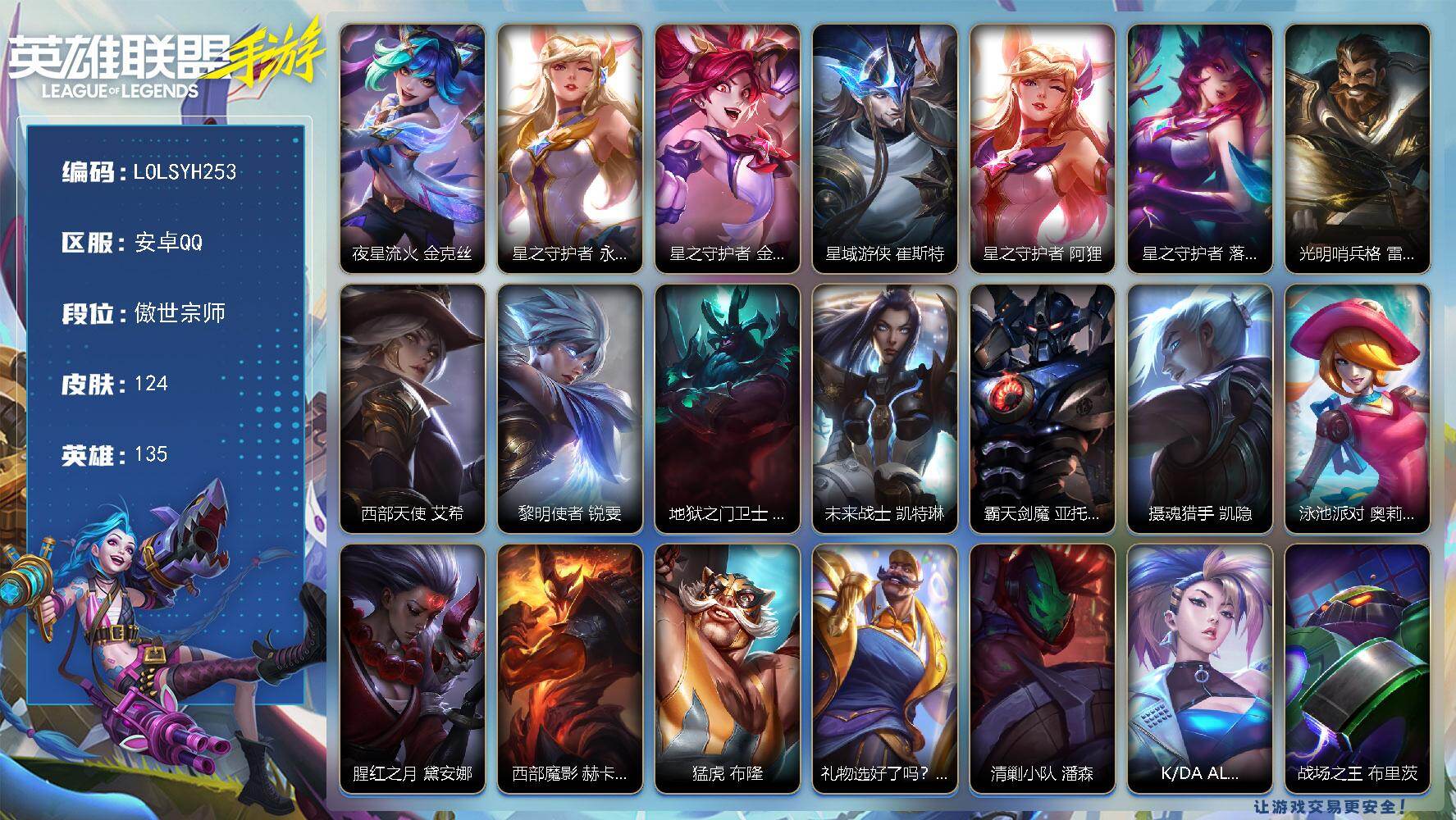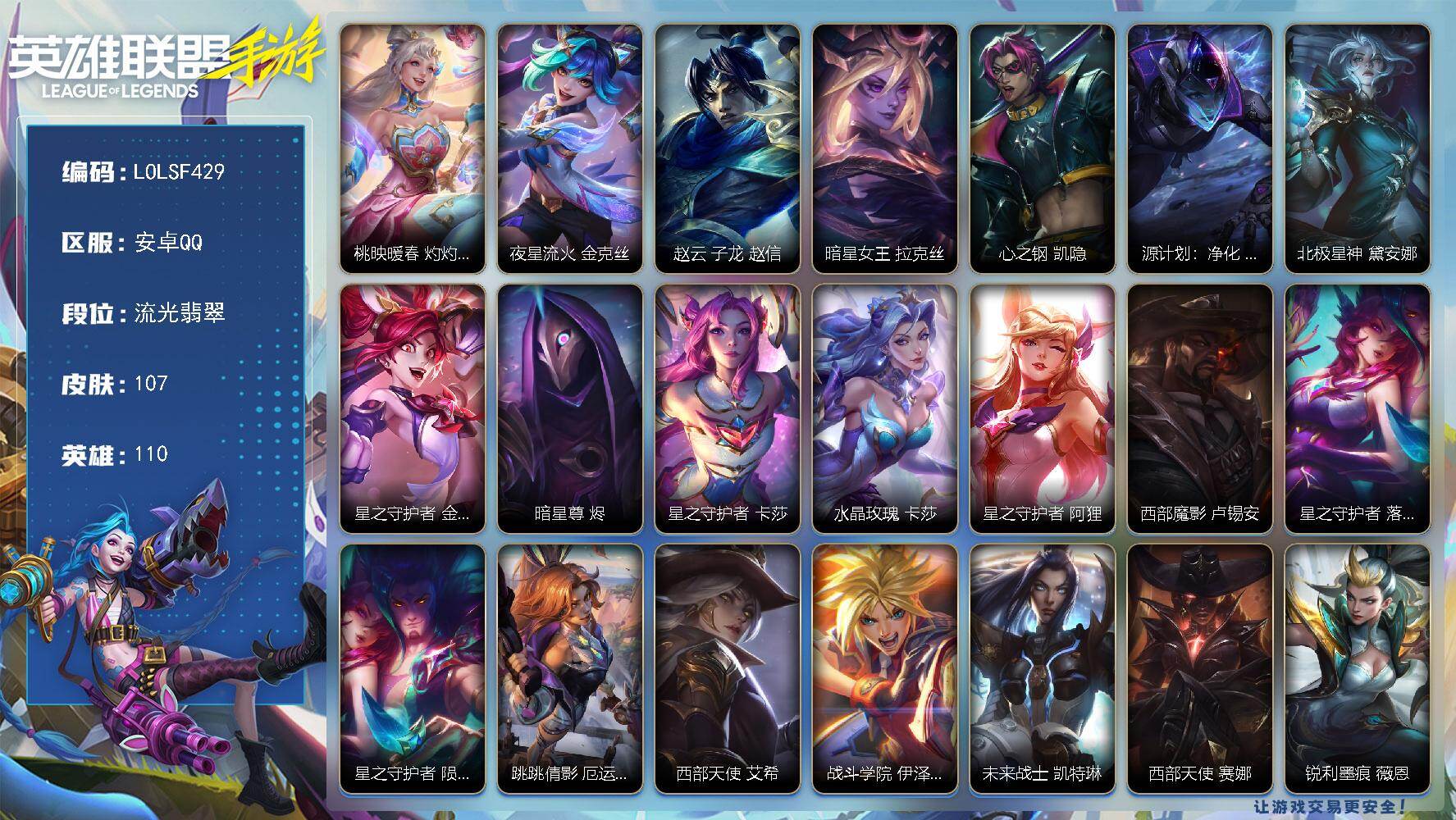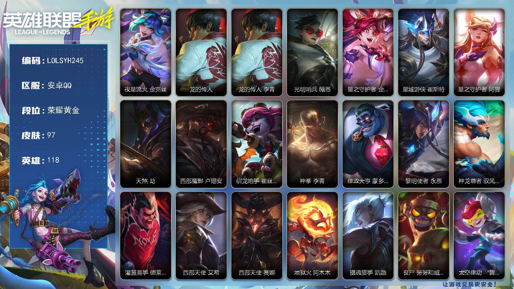 118英雄/97皮肤/荣耀黄金/夜星流火 金克丝/龙的传人 李青/光明哨兵 薇恩