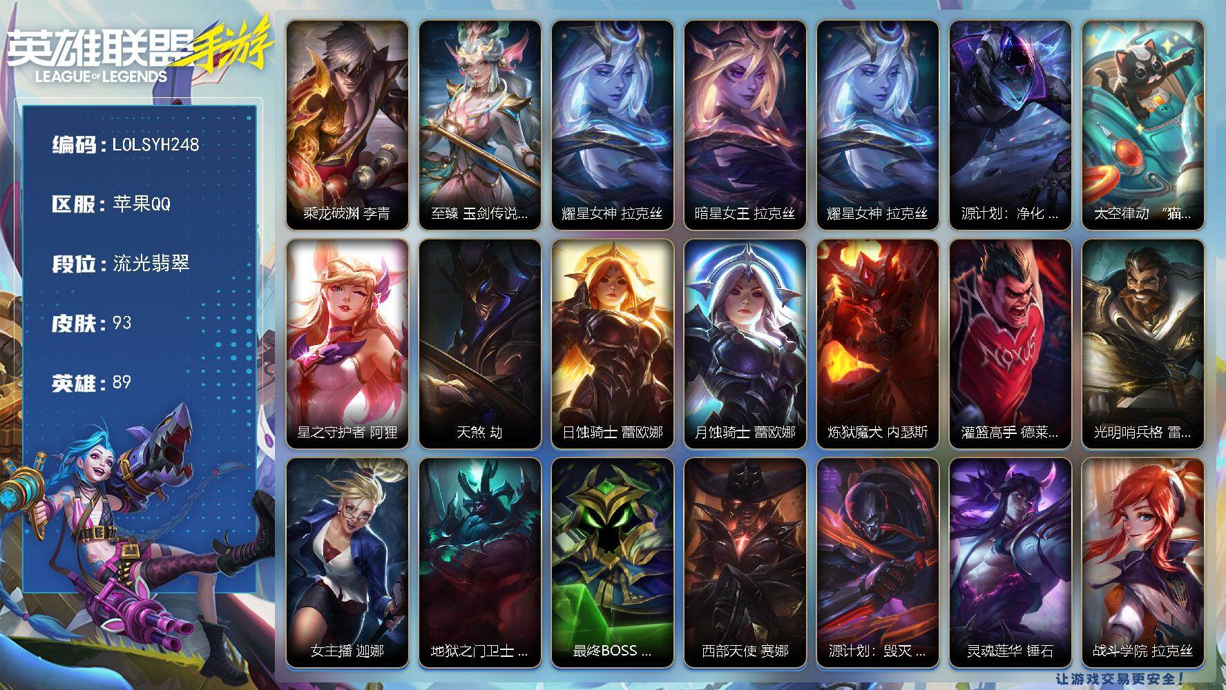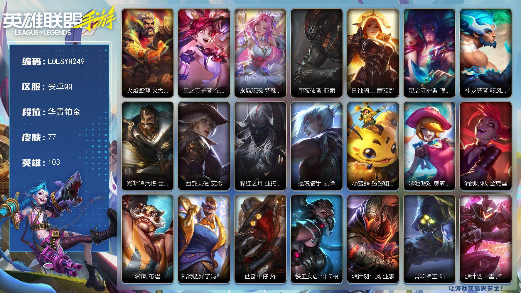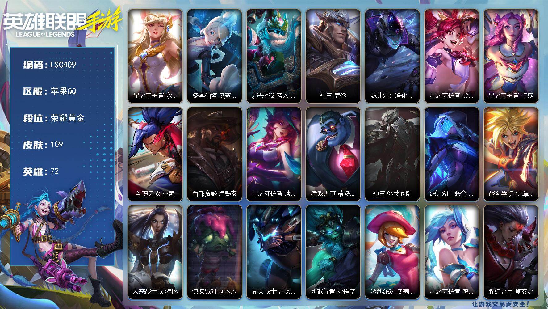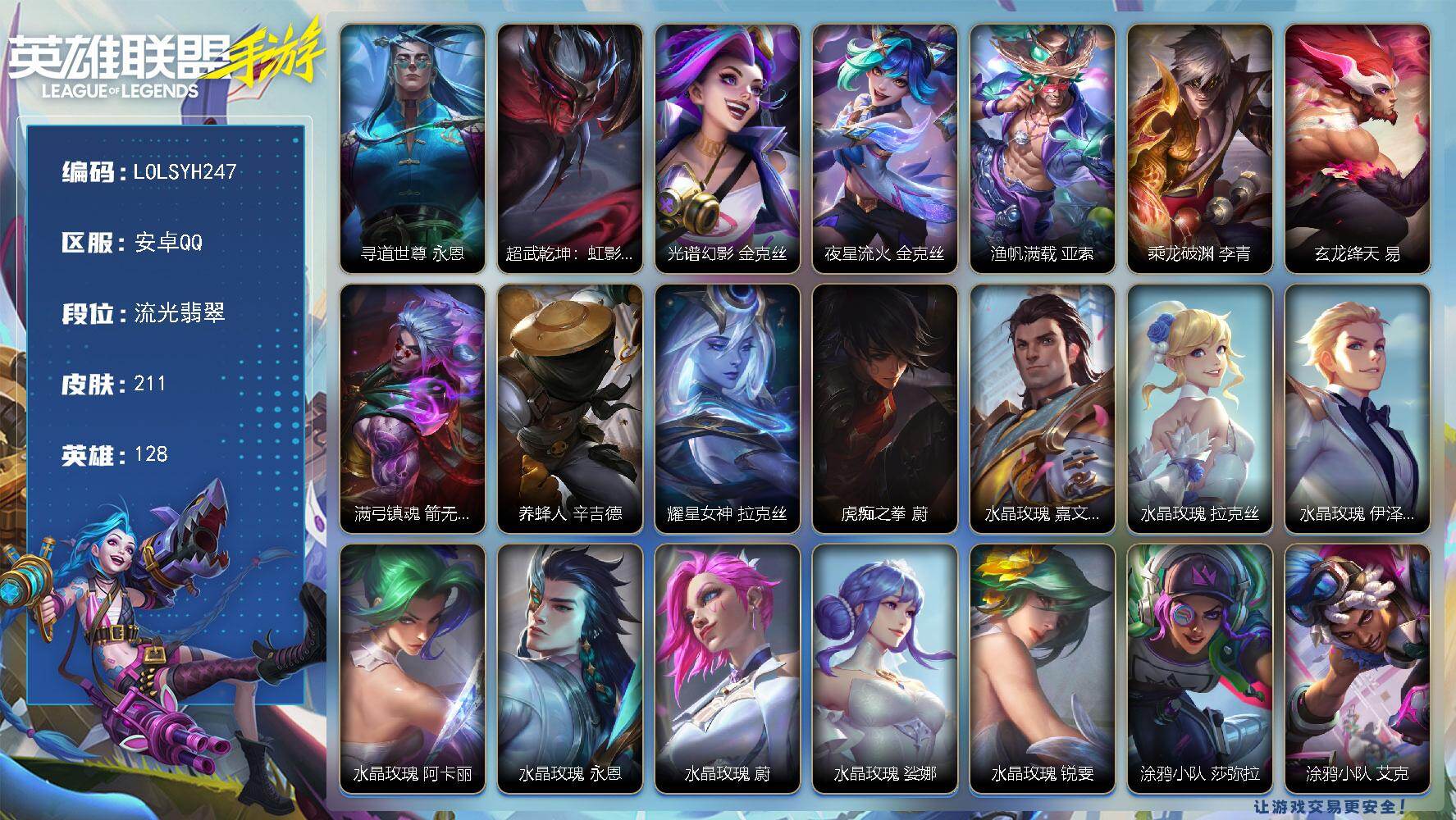 118英雄/97皮肤/荣耀黄金/夜星流火 金克丝/龙的传人 李青/光明哨兵 薇恩