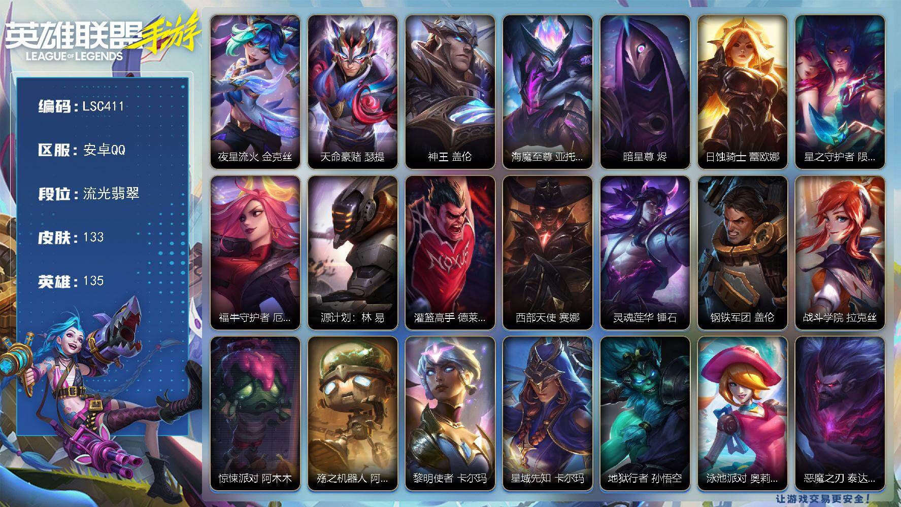 135英雄/133皮肤/2神话/10传说/56史诗/流光翡翠/夜星流火 金克丝/天命豪赌 瑟提/