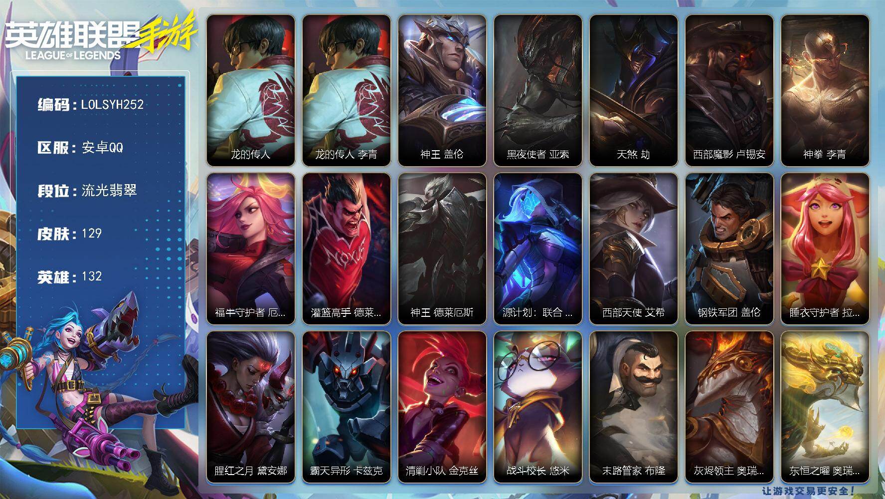 132英雄/129皮肤/流光翡翠/龙的传人 李青/神王 盖伦/黑夜使者 亚索/天煞 劫/