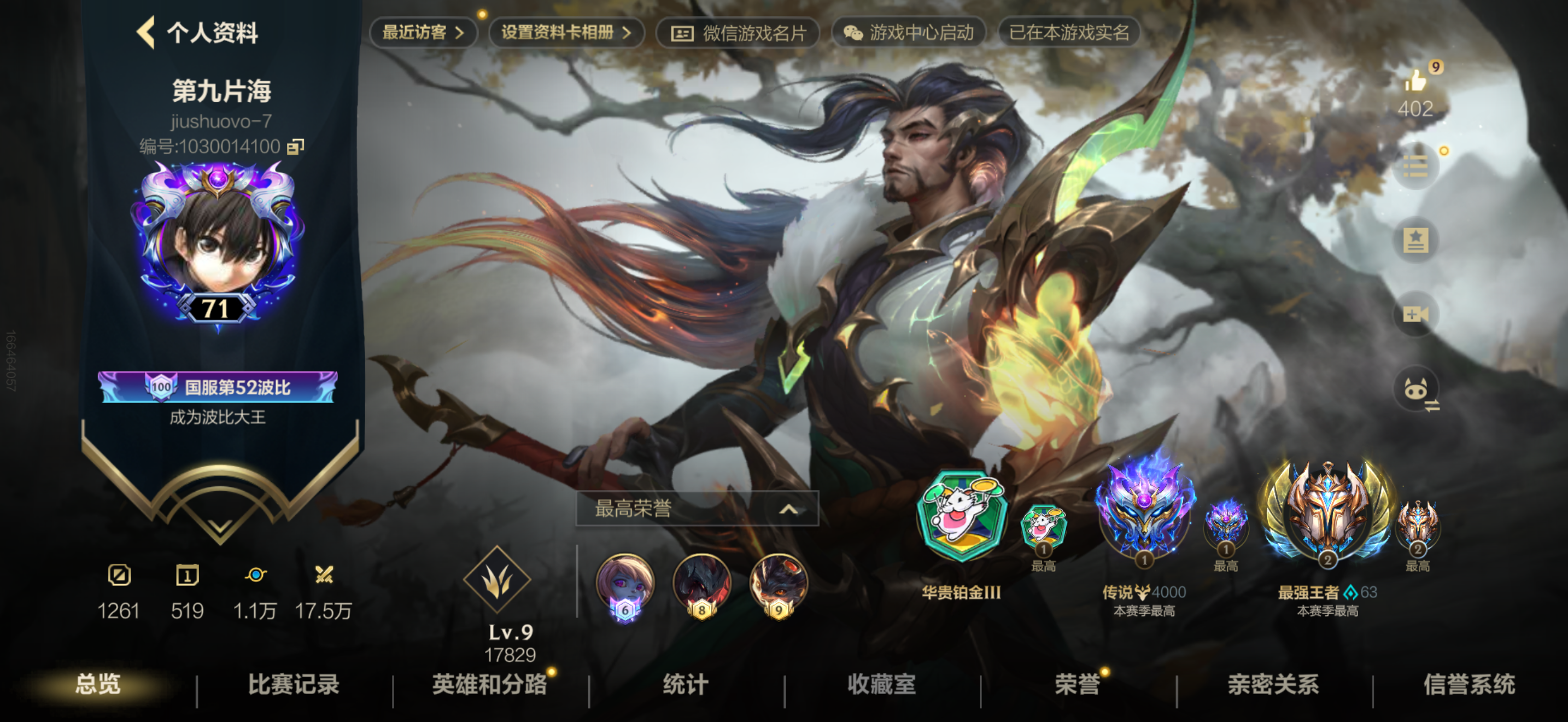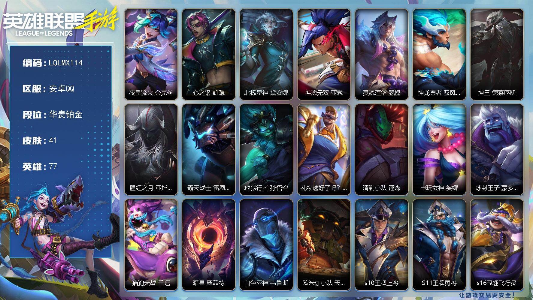 77英雄/41皮肤/1神话/6传说/11史诗/华贵铂金