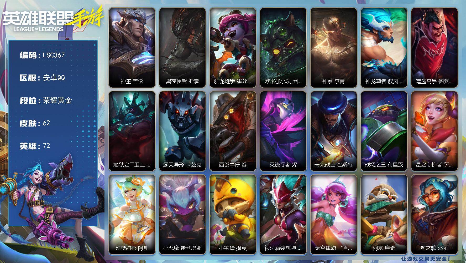 72英雄/62皮肤/荣耀黄金/神王 盖伦/黑夜使者 亚索