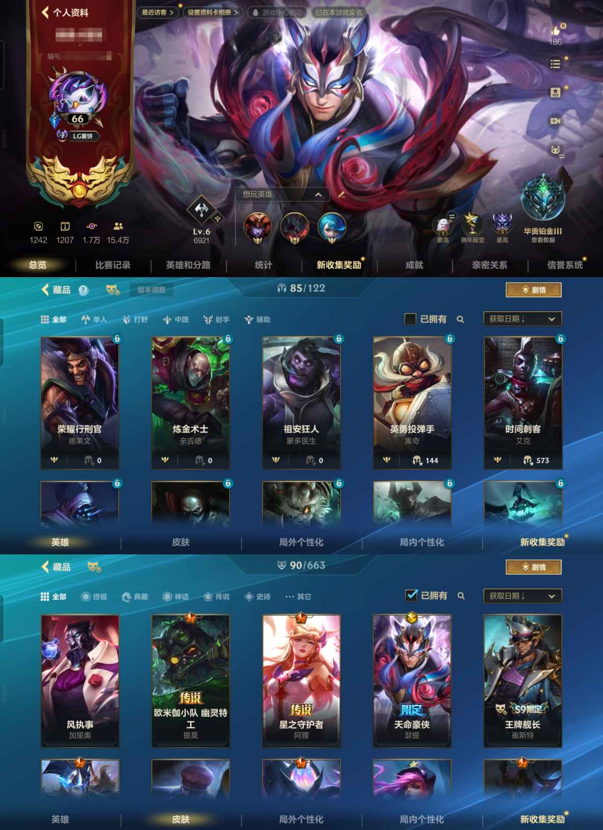 113级 106英雄 90皮肤 10传说