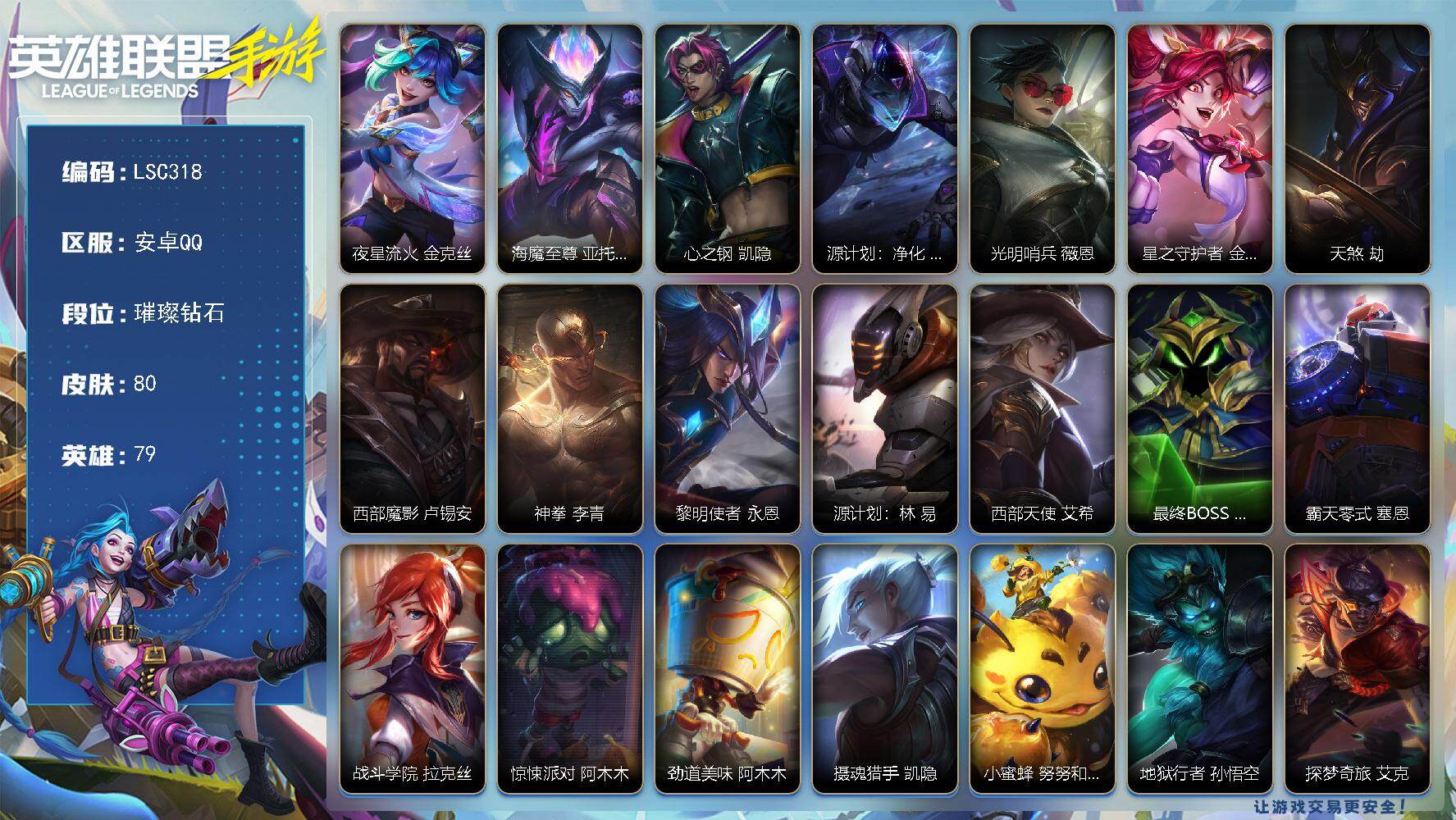 79英雄/80皮肤/璀璨钻石/夜星流火 金克丝