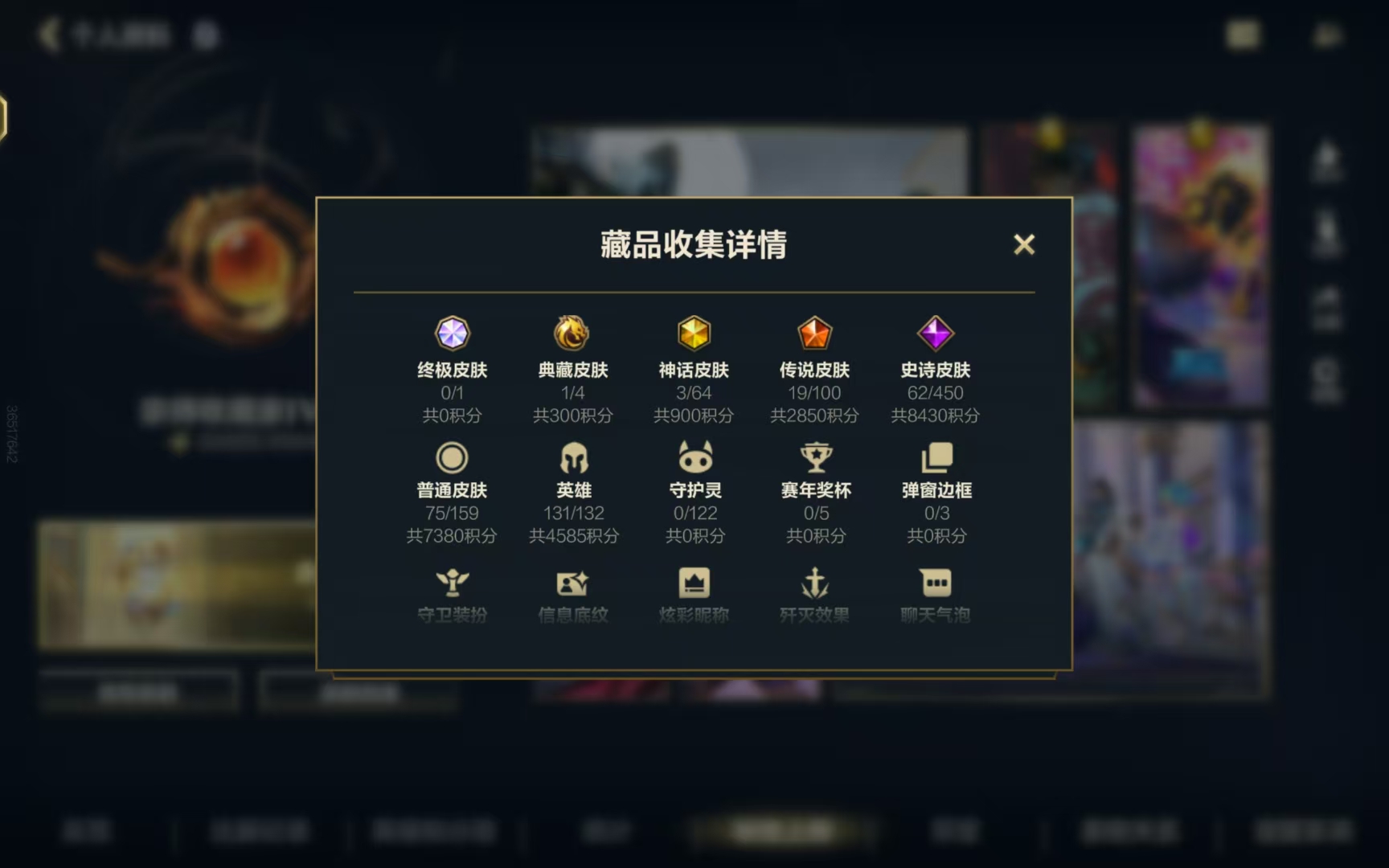 132英雄/217皮肤/2神话/22传说/100史诗/超凡大师/