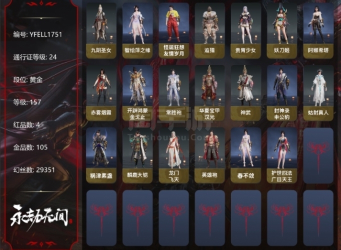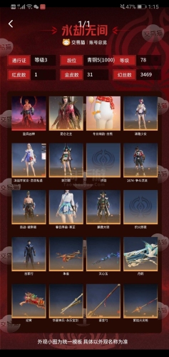 永劫无间(pc版)【端游】13个红,有岳山神君印,金皮也多具体看图,幻丝还有几万,嘴硬妖刀姬红装也出了价格可谈
