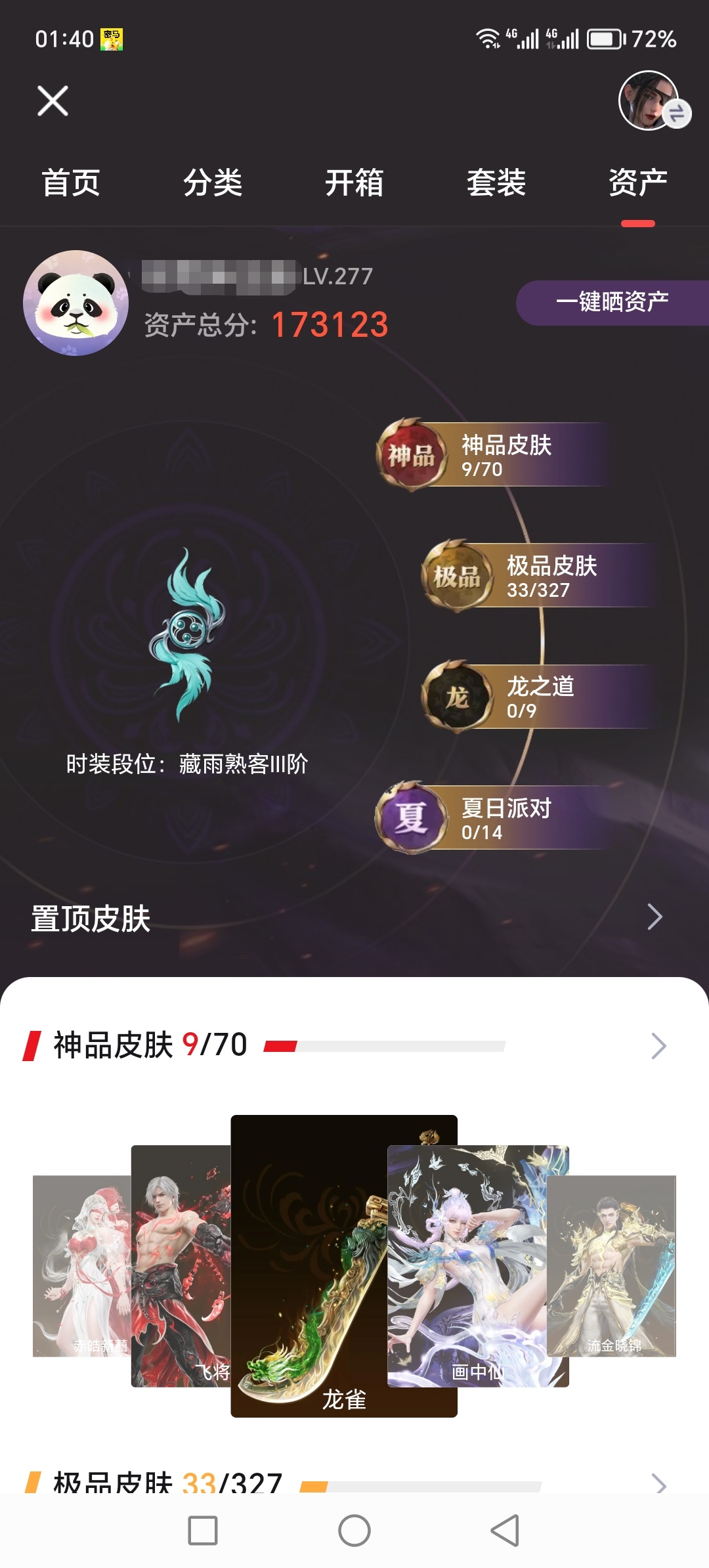 【9神品 33极品】【游戏等级】277【大区】国服【神品皮肤】龙雀 画中仙