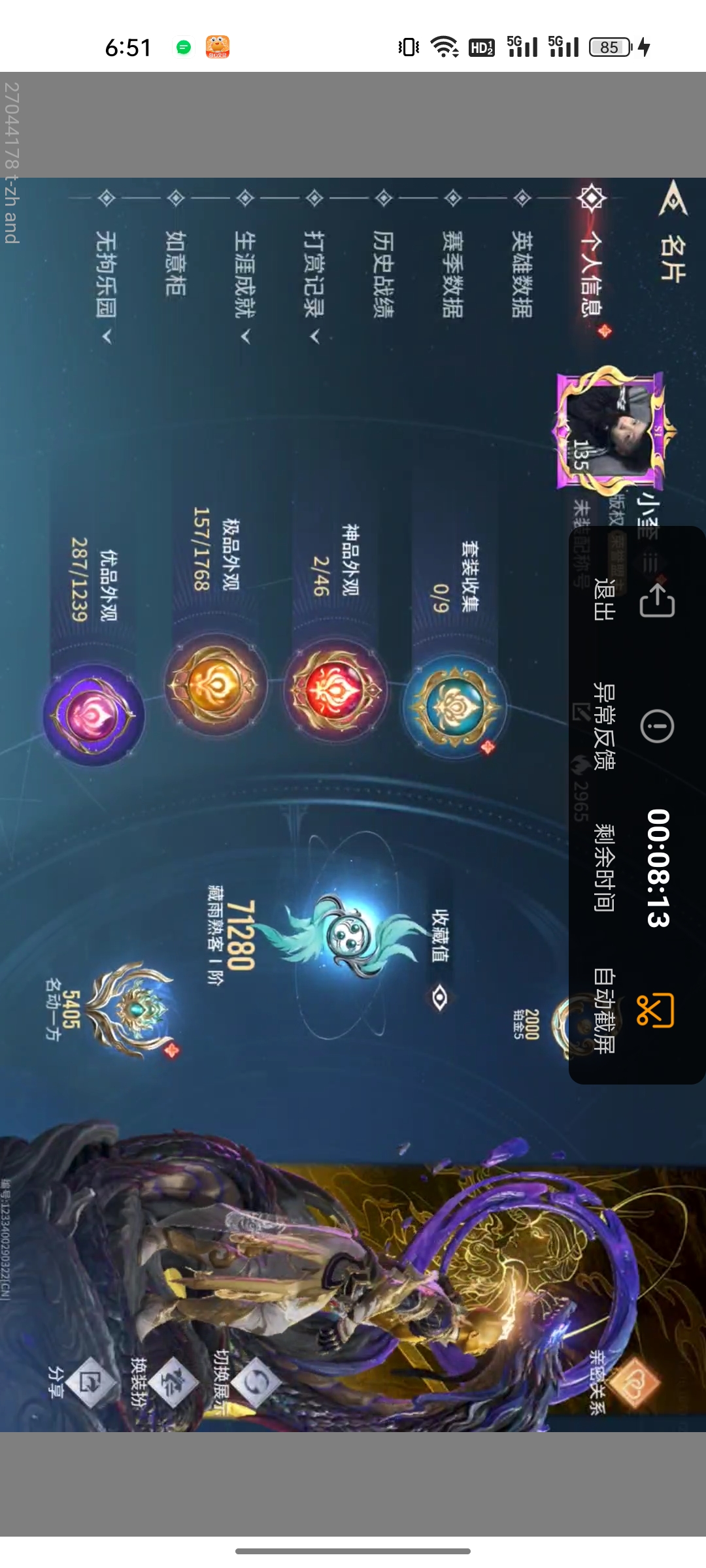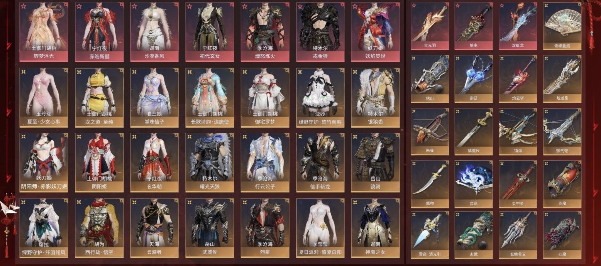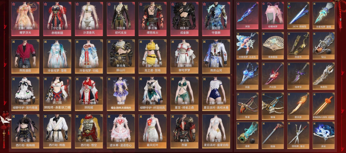 37万收藏值武器除横刀和双刀飞刀没红皮其他全满,衣服除无尘李寻欢希腊季莹莹没红皮其他每个英雄均有皮肤