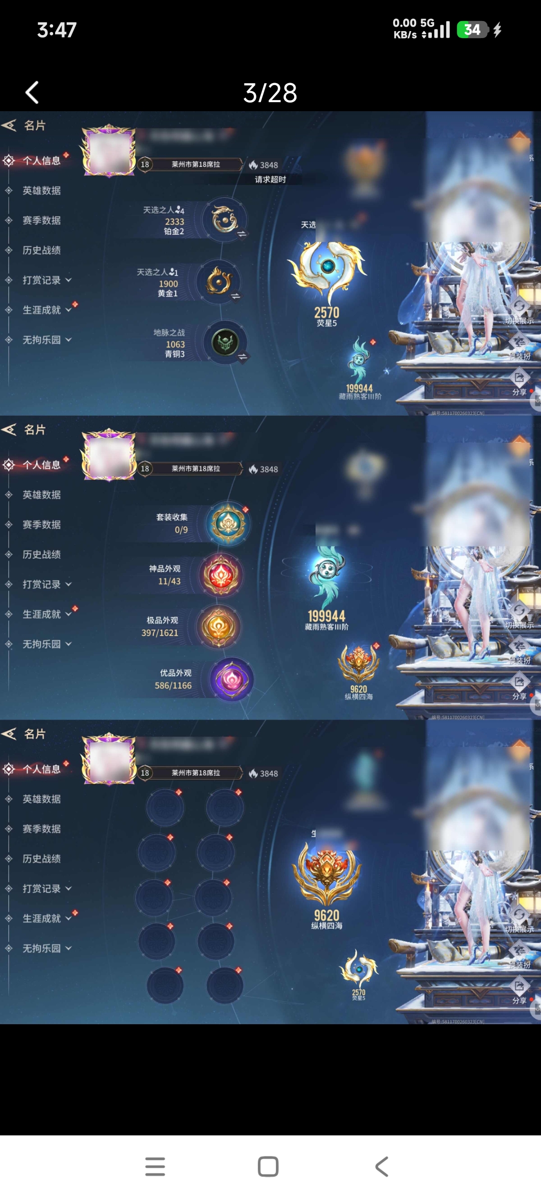 3个红皮,顾清寒席拉九尾狐,两个武器红,金箍棒,紫薇剑,背包里有20自选宝箱,季莹莹红皮差10抽