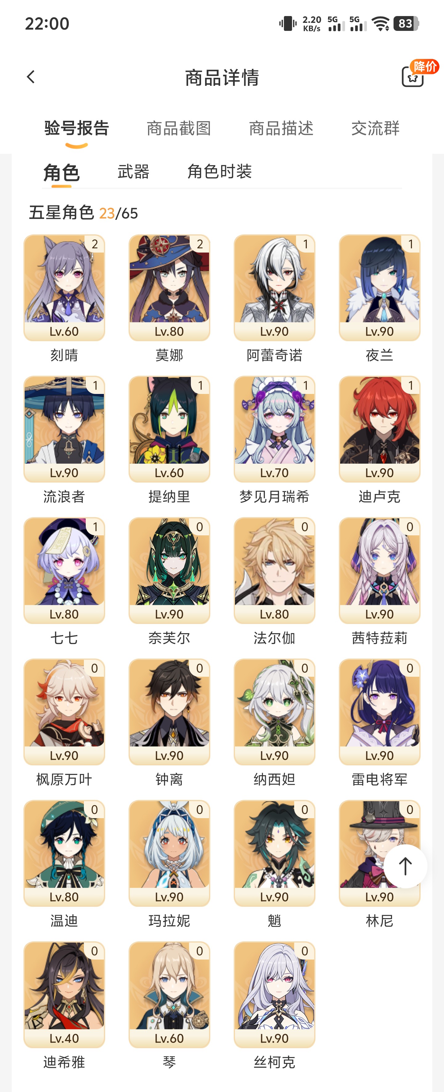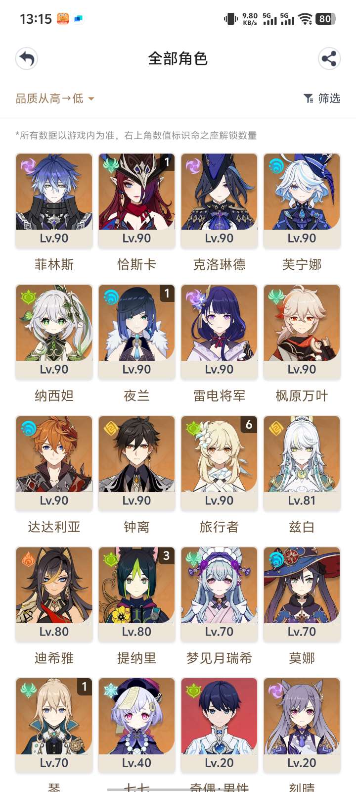 官服54金+溢出2个命座,6+2夜兰,3+1雷神,满命琴,兹白,菈乌玛,水神,希诺宁,草神,风神等
