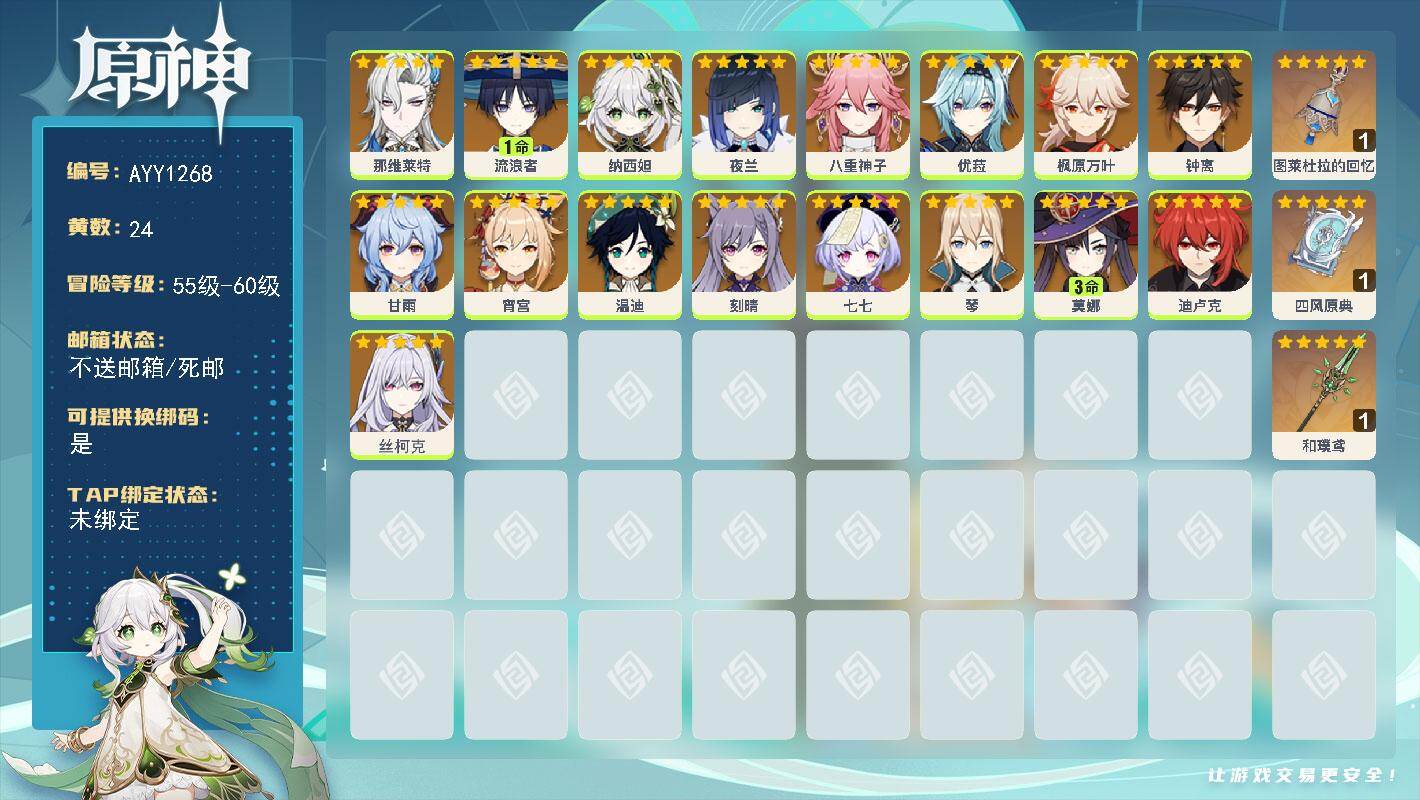 55级/17黄/女主/12个五星角色/3个五星武器0命流浪者,1命提纳里,0