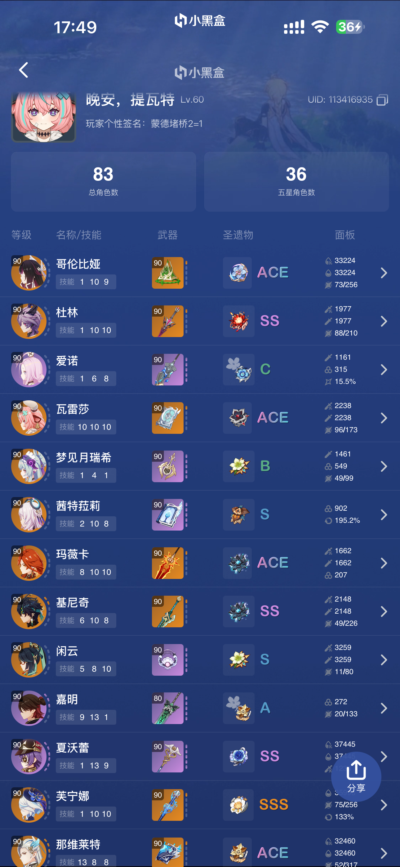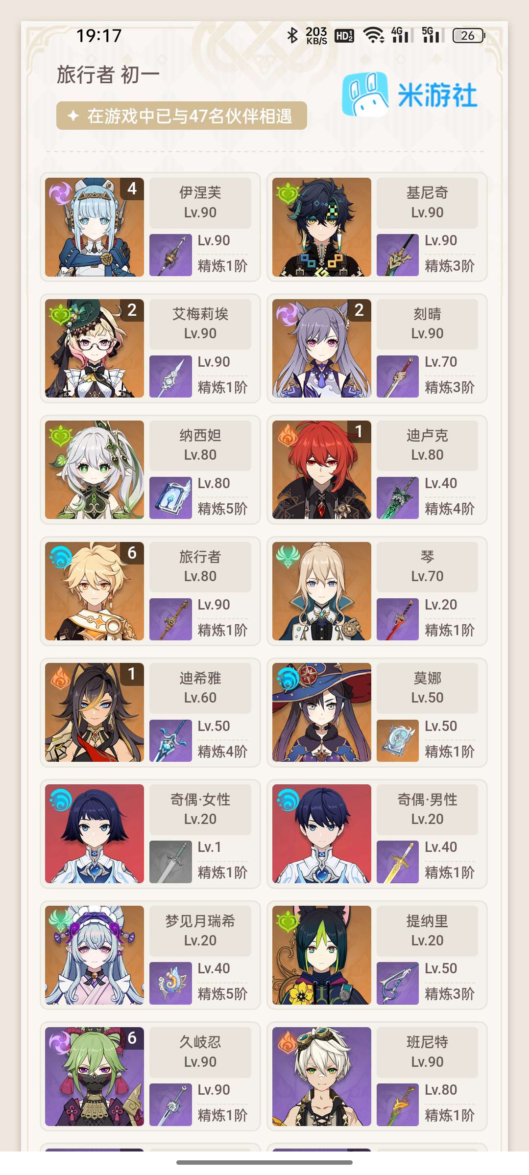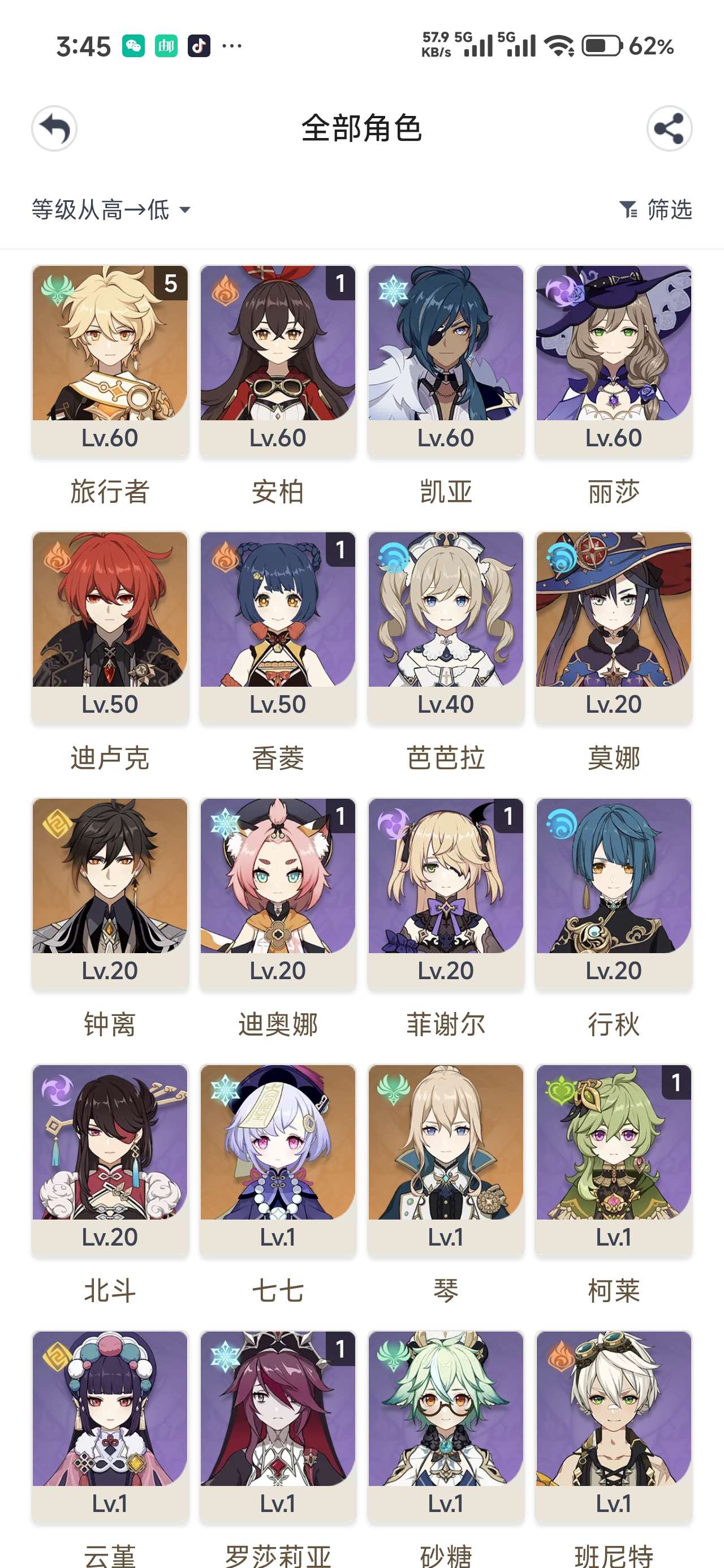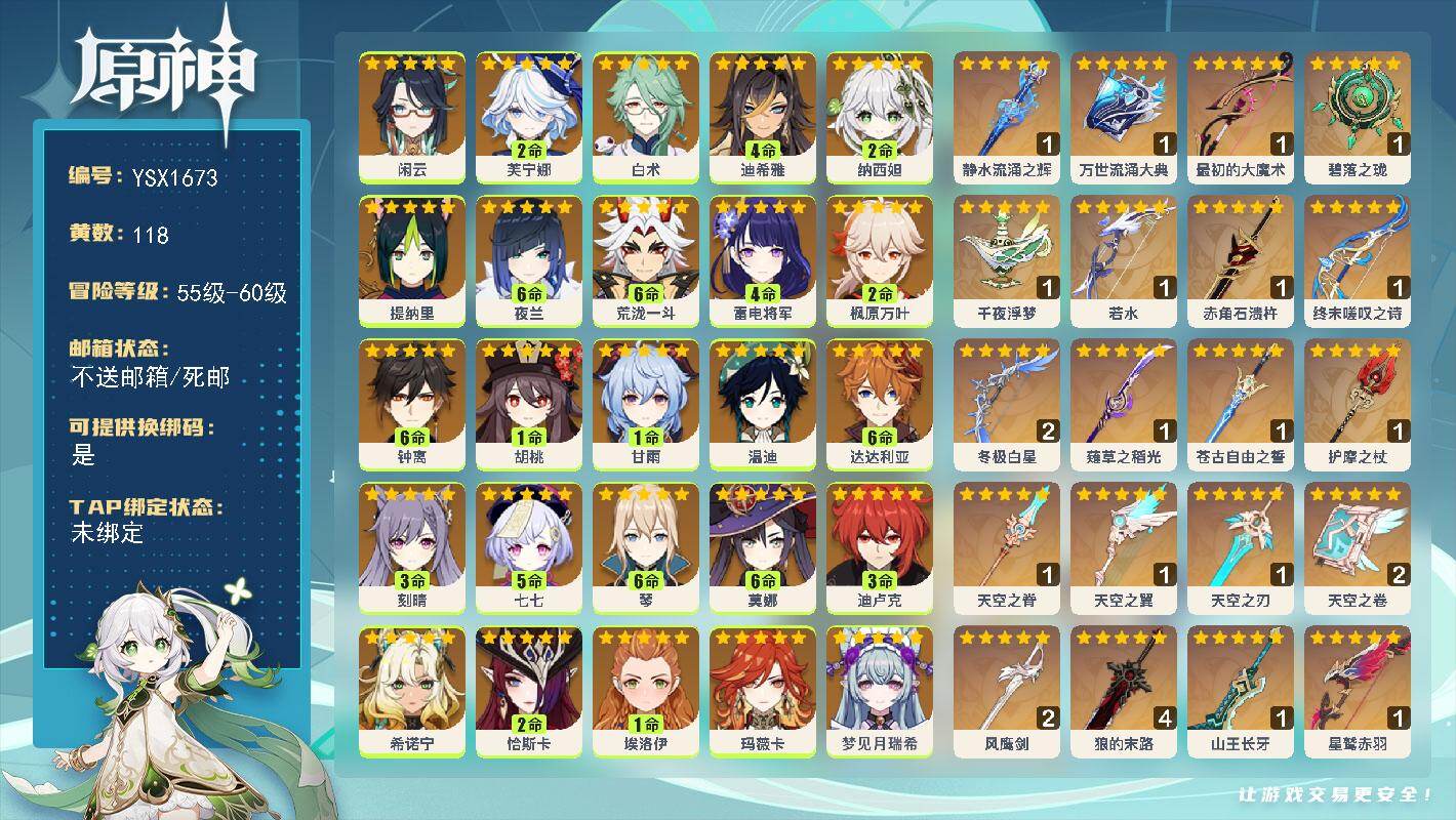 60级/118黄/女主/26个五星角色/21个五星武器/