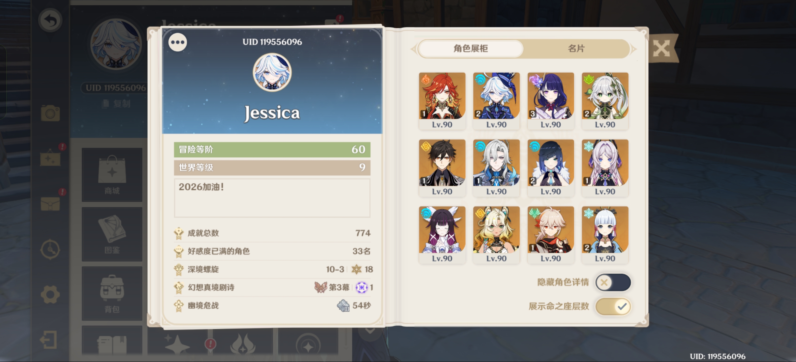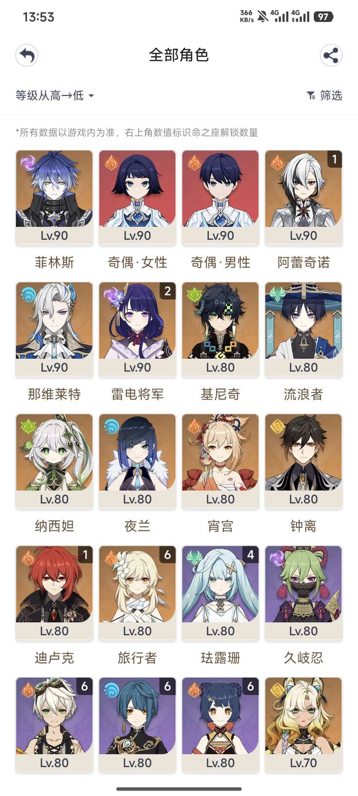 57级/19黄/女主/12个五星角色/5个五星武器/雷电将军/钟离/夜兰
