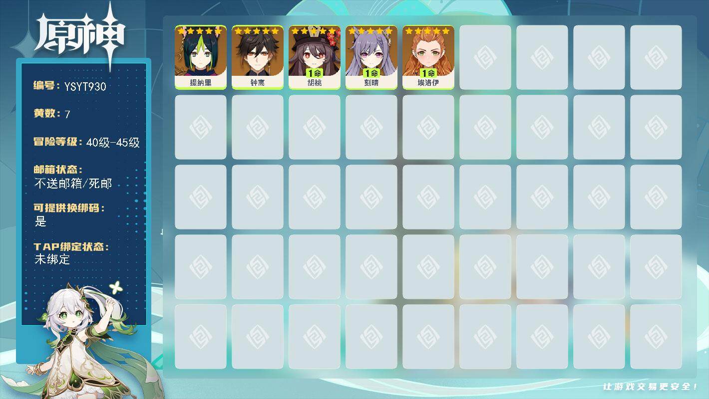 44级/7黄/女主/5个五星角色/钟离/1命胡桃/1命刻晴/0命埃洛伊/提纳里