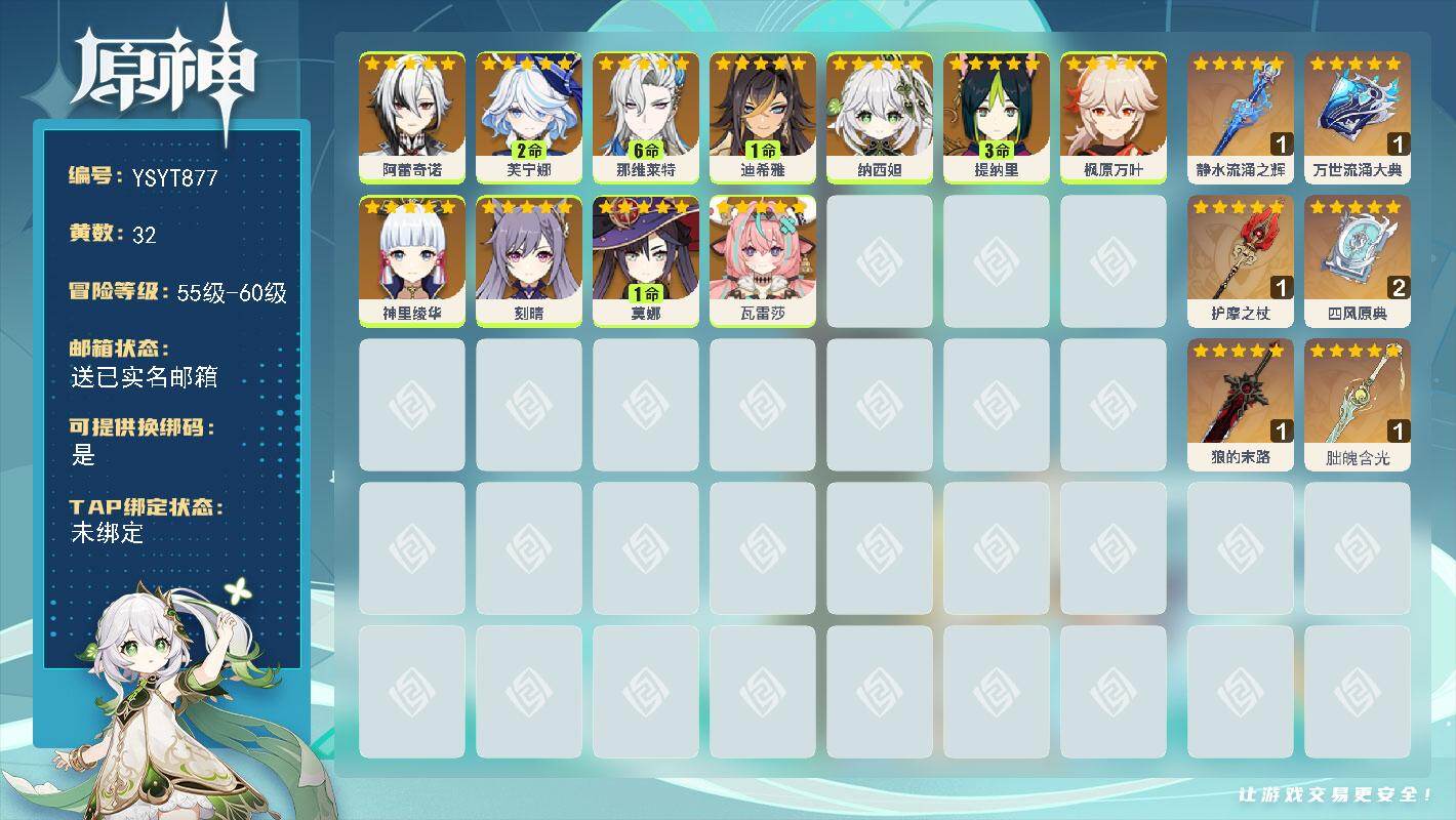 57级/32黄/女主/11个五星角色/7个五星武器/满命那维莱特/2命芙宁娜/