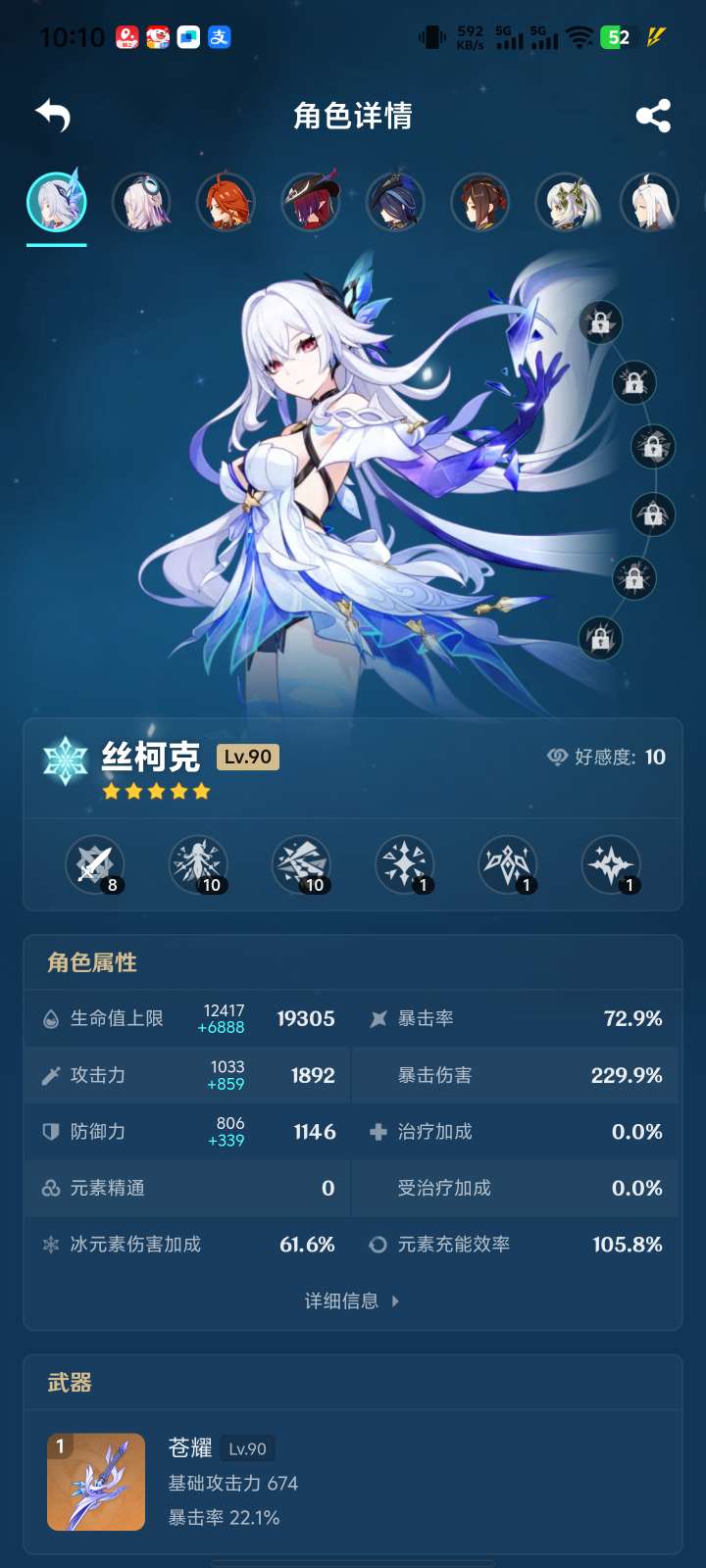 60级/53黄/女主/22个五星角色/13个五星武器0命克洛琳德,0命闲云,