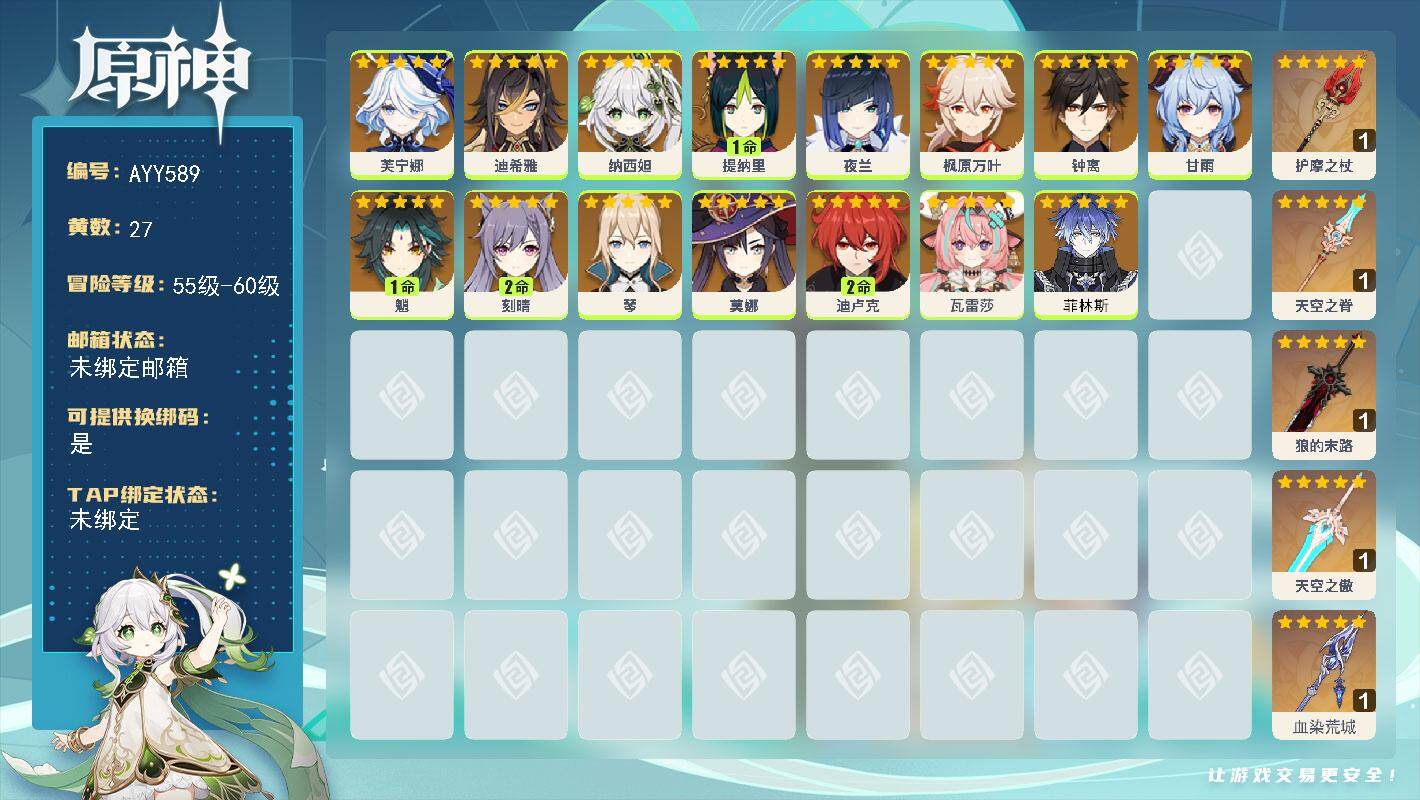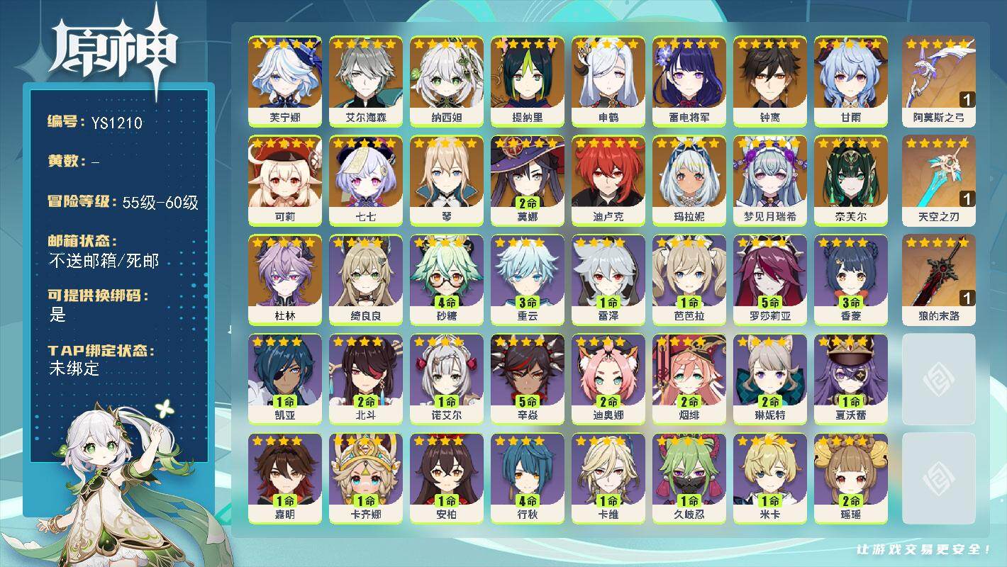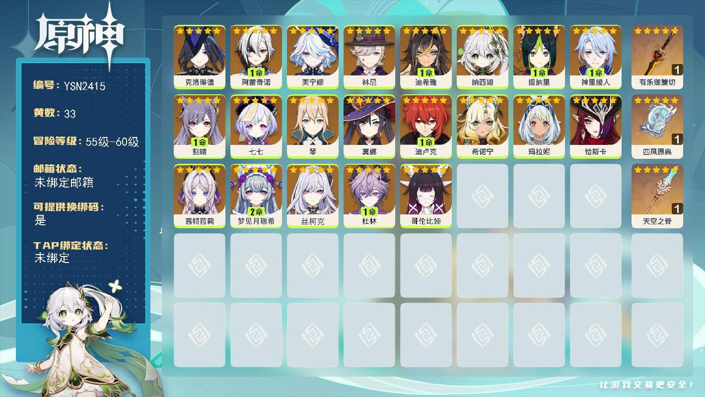 55级/20黄/女主/13个五星角色/3个五星武器/克洛琳德/纳西妲