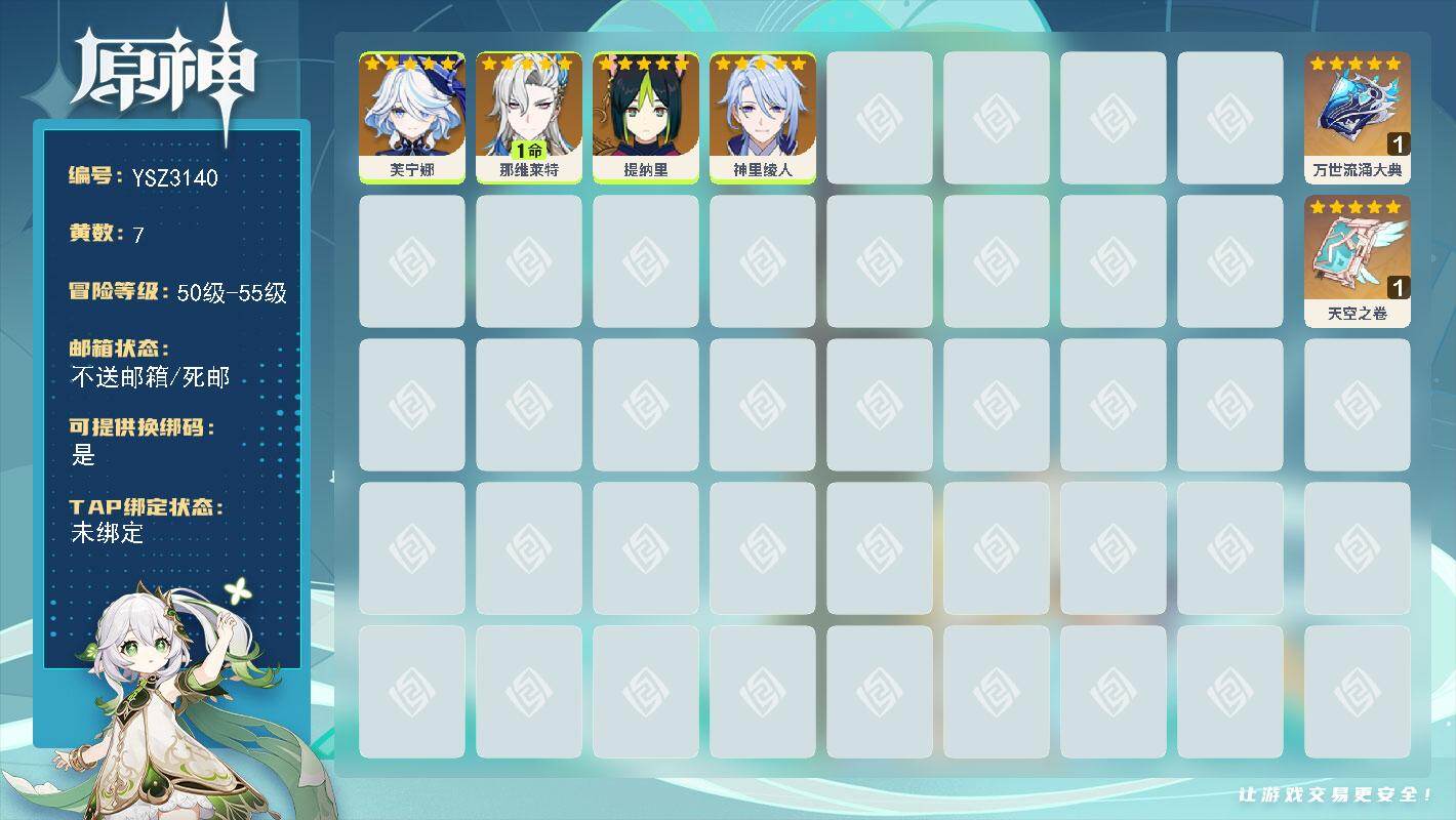 54级/7黄/女主/4个五星角色/2个五星武器/1命那维莱特/芙宁娜/提纳里/神里绫人/万世流涌大典/天空之卷