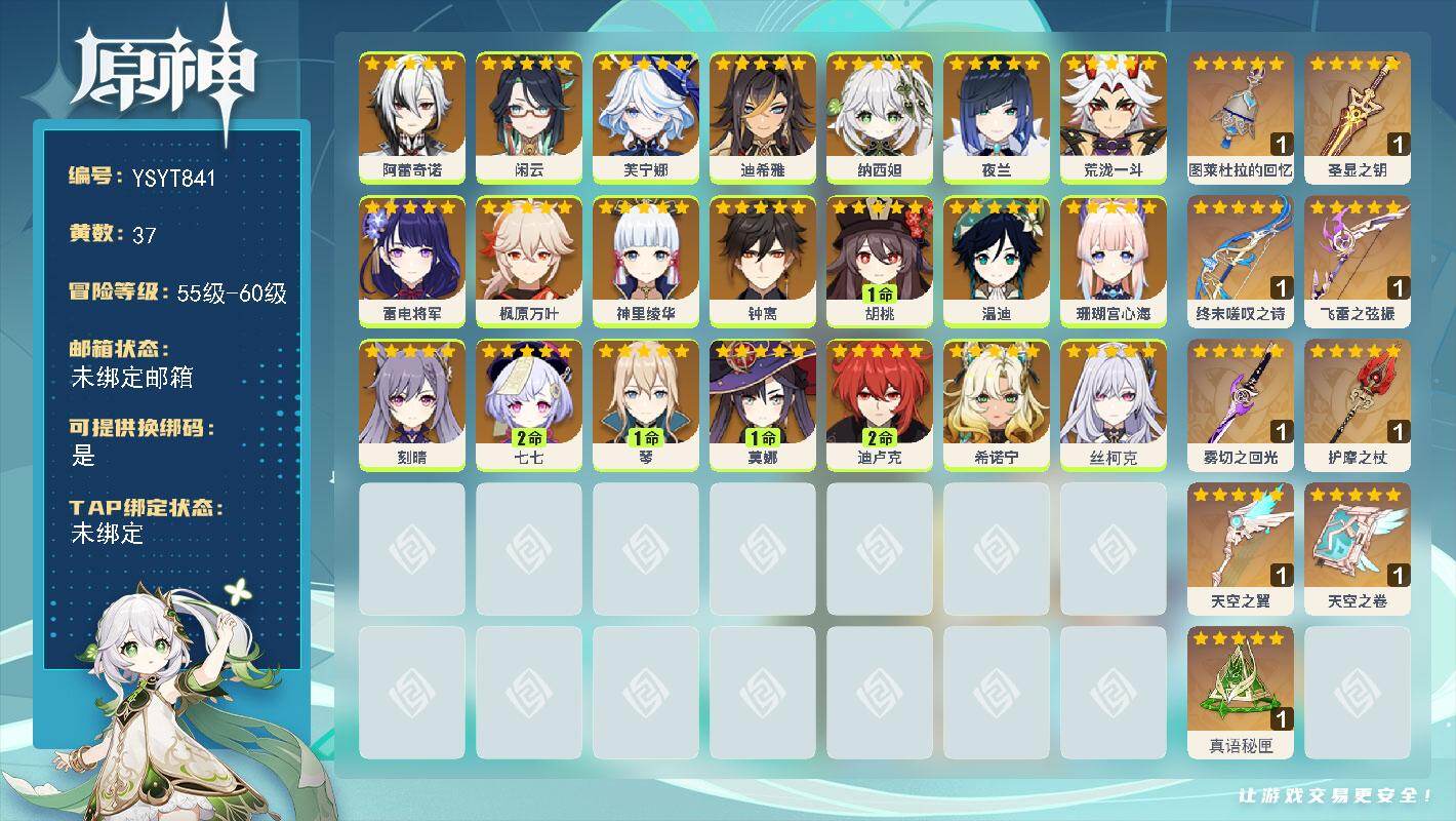 60级/37黄/女主/21个五星角色/9个五星武器/神里绫华/枫原万叶/